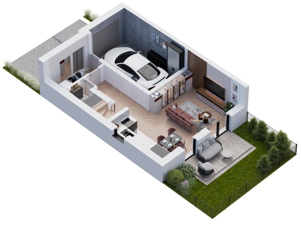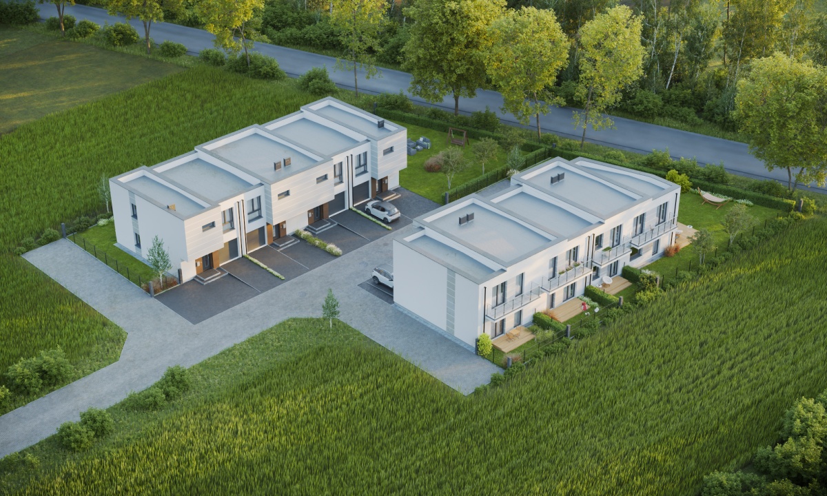jest we własny garaż z podjazdem. Każdy z domów posiada urokliwy