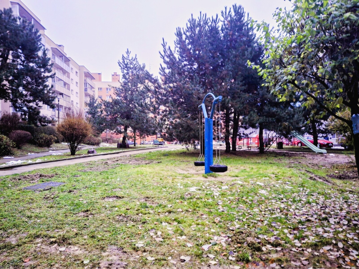 Obok bloku duży park do spacerów i odpoczynku.