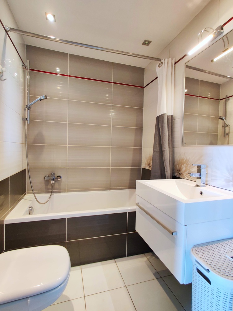 łazienka: duża wanna z zestawem prysznicowym, lustro zabudowane z oświetleniem, WC zabudowany Koło SLIM, wnęka z półkami, szafka z szufladami i wbudowaną umywalką, sufit obniżany z oświetleniem halogenowym (4 halogeny), cała łazienka w kaflach, drzwi z przeszkleniem matowym z zamkiem