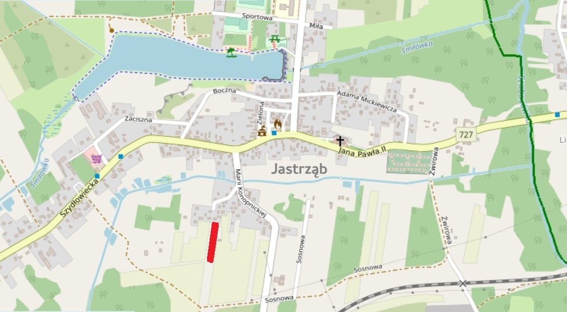 Działka o regularnym kształcie 32 na 33m i równej powierzchni 1064m2, położona w cichej okolicy, w granicach miasta Jastrząb przy ulicy Konopnickiej (na zakończeniu odcinka asfaltowego), w pobliżu zabudowy jednorodzinnej, z warunkami zabudowy (budowa domu jednorodzinnego z możliwością przyłączenia prądu, wody miejskiej, łącza światłowodowego). Miejska sieć kanalizacji jest w fazie projektowania.