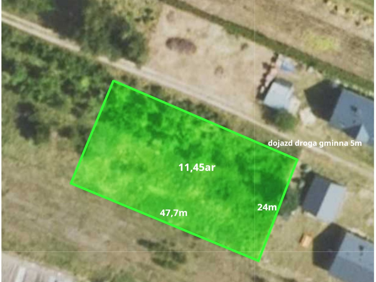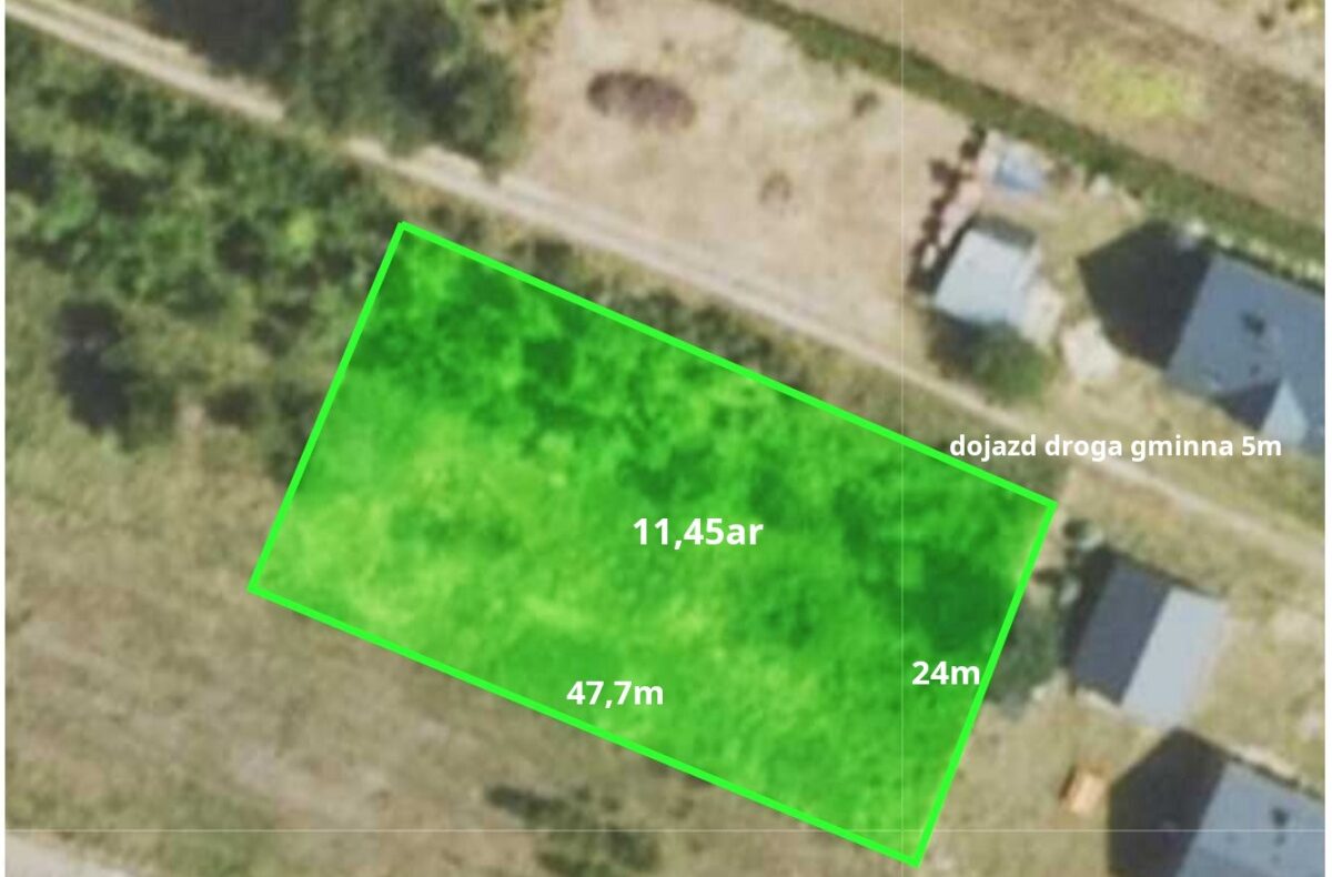 Działka budowlana o pow. 11,45ar o wymiarach 47,7m x 24m, płaska o kształcie prostokąta. Działka z pozwoleniem na budowę i gotowym projektem domu (dom parterowy APS 245). Przeprowadzone badania geologiczne.