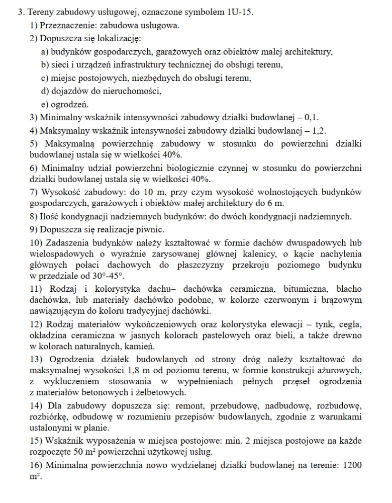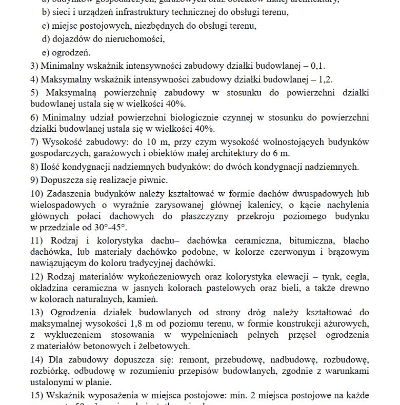 – Intensywność zabudowy 0,10–1,20, wysokość budynków do 10 m (2 kondygnacje)