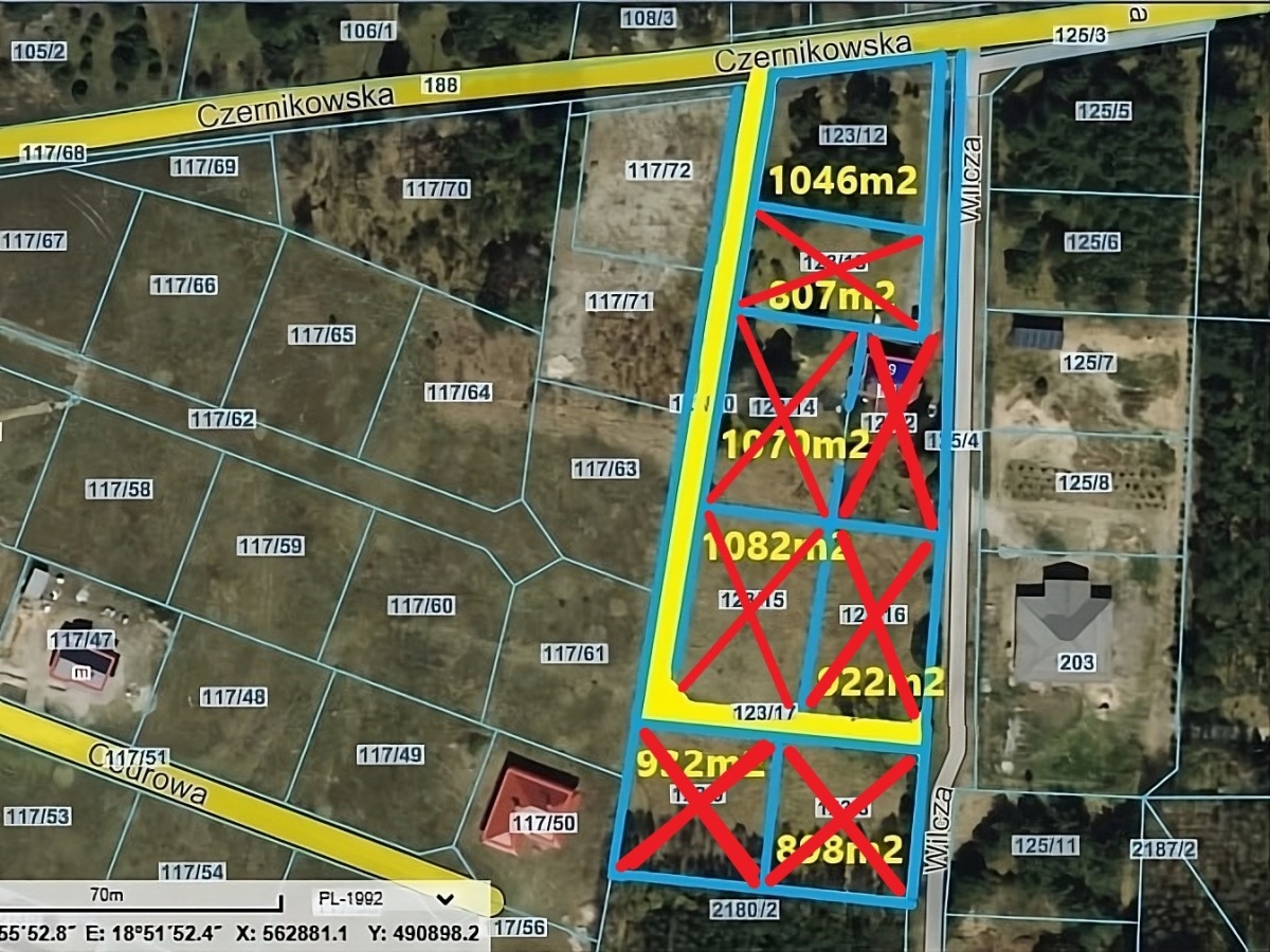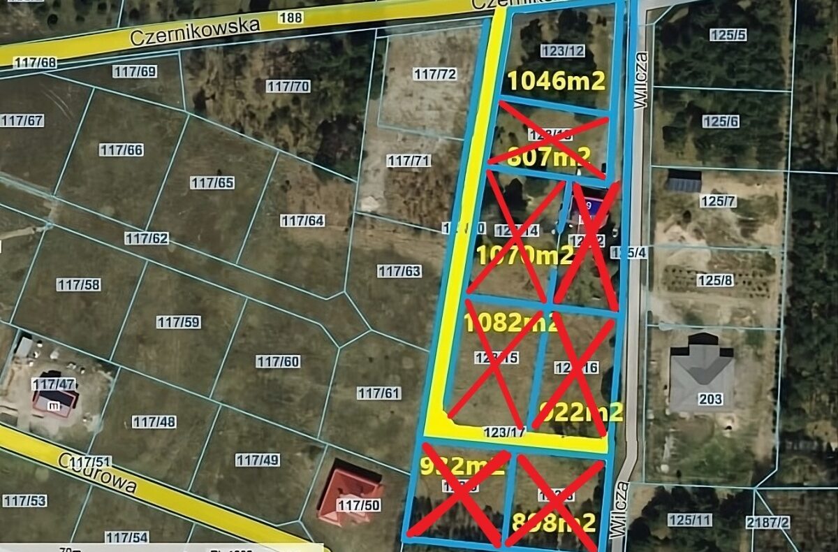 Działki przekreślone czerwonym krzyżykiem są już sprzedane.