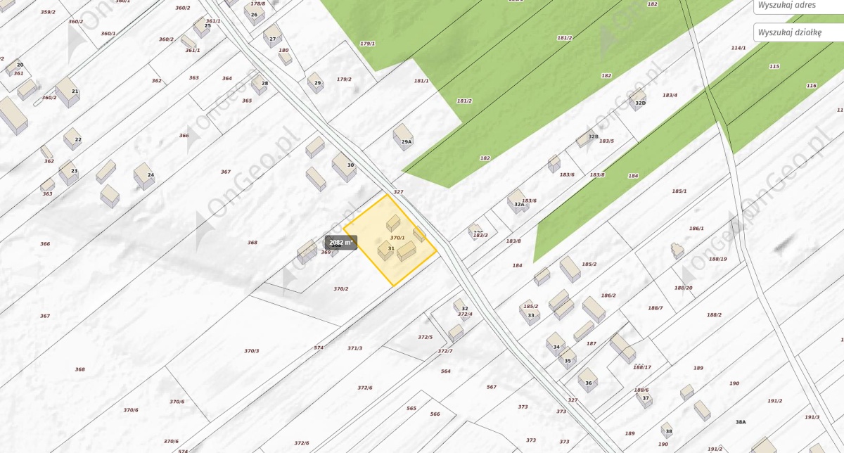 Numer działki: 370/1 budowlana Powierzchnia: 1900 m² zabudowana małym domkiem rekreacyjnym i komórkami gospodarczymi.