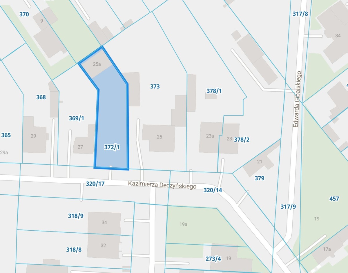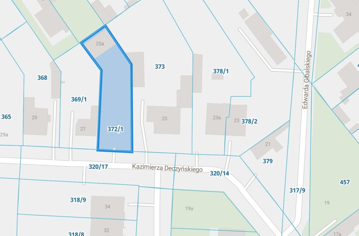 Działka o powierzchni 583 m2 z murowanym budynkiem garażowym o powierzchni użytkowej 67m2 . Nr 372/1 obręb B-23 .Media na działce prąd ( 17kW ), gaz. W ulicy woda, kanalizacja, światłowód. Do działki jest projekt domu parterowego 118m2 z pozwoleniem na budowę ważnym do 05.2026 .