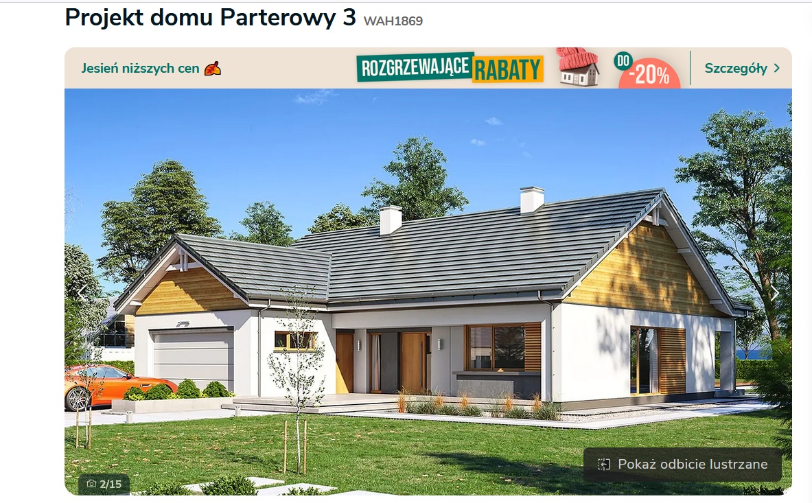 Projekt domu z garażem dwustanowiskowym pracowni MGProjekt z Warszawy. Nazwa "Parterowy 3" adoptowany do wymiarów działki tj. powiększony w części mieszkalnej i garażowej do wym. 1700 x 1110 a garaż 826 x 694 połączony z bryłą budynku.. Pow. b.m. -170 m2 plus poddasze do zagospodarowania a pow. garażu 42 m2 (po obrysie wewnętrznym). Zmieniono usytuowanie wjazdu do garażu na przedłużoną ścianę boczną.