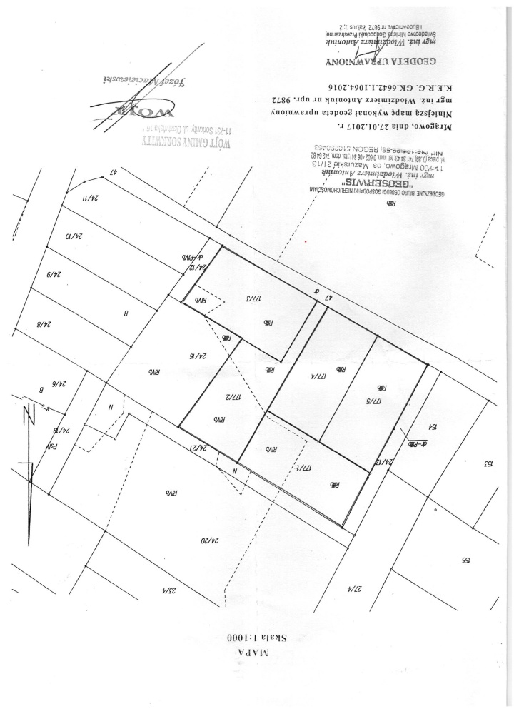 Dla wszystkich działek, zgodnie z nowym podziałem, wydane zostały decyzje o warunkach zabudowy na budowę na każdej działce budynku mieszkalnego. Klasa gruntu IV a i IV b, nie wymaga wyłączenia z produkcji rolnej.