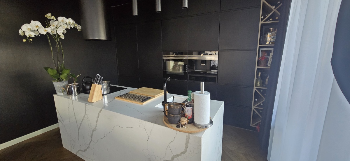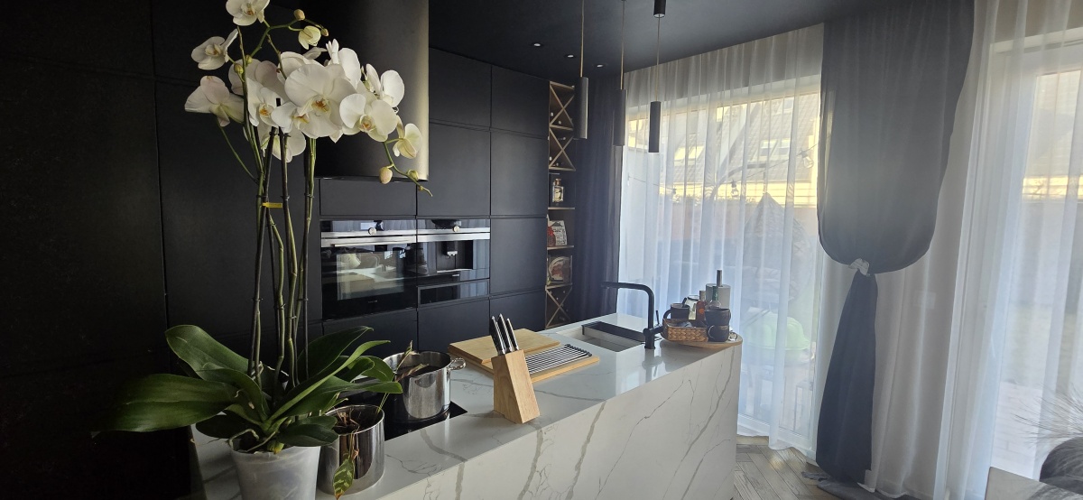 Kuchnia wykonana na indywidualne zamówienie z wyspą z konglomeratu stanowi centralny punkt domu – efektowna wizualnie, a jednocześnie niezwykle funkcjonalna. Cały parter objęty jest ogrzewaniem podłogowym, co zapewnia wysoki komfort użytkowania.
