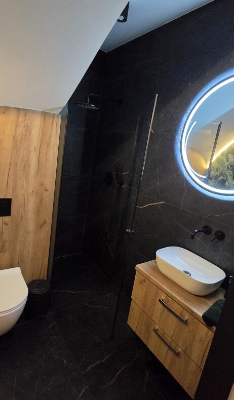 Łazienka na piętrze została zaprojektowana jako prawdziwa domowa strefa relaksu. Oprócz przestronnego prysznica typu walk-in znajduje się tu również wanna – idealna na wieczorny odpoczynek po intensywnym dniu. Ogrzewanie podłogowe dodatkowo podnosi komfort użytkowania tej przestrzeni.