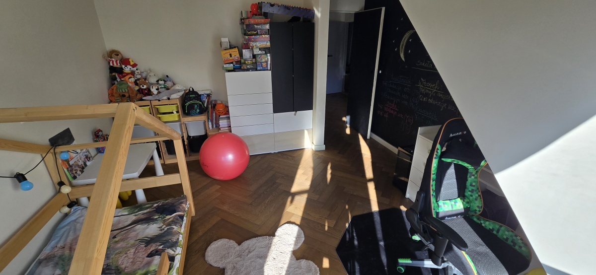 Na szczególną uwagę zasługują pokoje dziecięce – przestronne, jasne, z wysokimi sufitami i przytulnymi skosami. To wnętrza, które pozwalają dzieciom stworzyć własną, indywidualną przestrzeń do nauki, zabawy i rozwijania pasji. To dom, który naturalnie dopasowuje się do zmieniających się potrzeb rodziny.