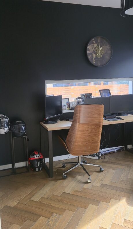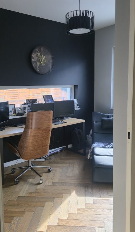 Na tym poziomie znajduje się również gabinet – komfortowa przestrzeń do pracy z domu, prowadzenia spotkań online lub stworzenia prywatnej biblioteki.