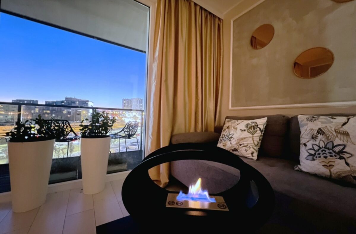 Zainstalowane w salonie oświetlenie, zaprojektowane z wykorzystaniem kryształowych lamp i ledów, wyczarowuje cudowną atmosferę. Centralnym punkt pomieszczenia jest stylowy biały stół, otoczony wygodnymi fotelami. Nad stołem góruje mozaika zaprojektowana z fazowanych luster, w której odbijają się światła kryształowych lamp. Niewątpliwym atutem salonu jest część wypoczynkowa z wygodną, rozkładaną kanapą, zapraszającą do relaksu. Przez duże panoramiczne okno roztacza się z niej rozległy widok na panoramę Moreny.