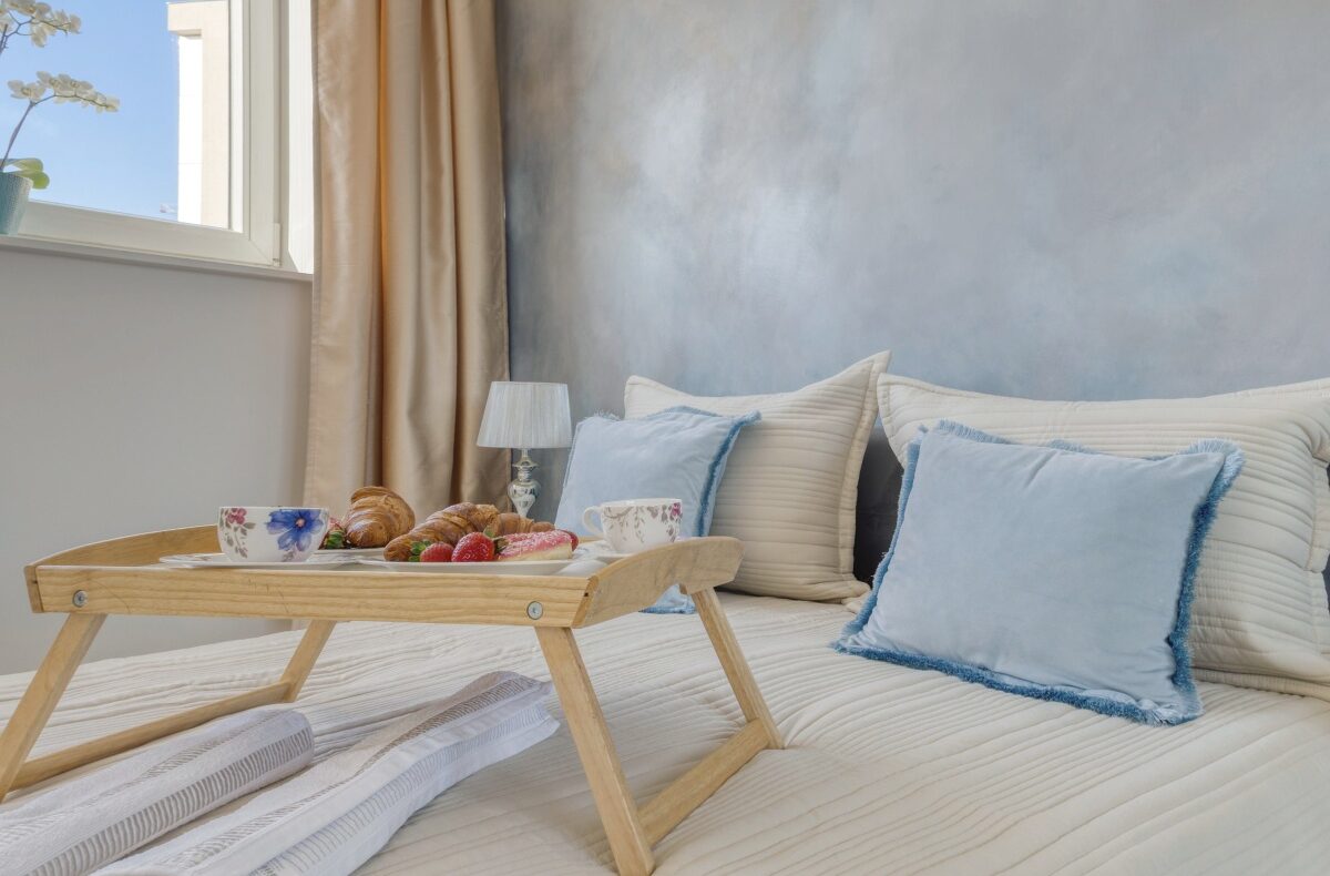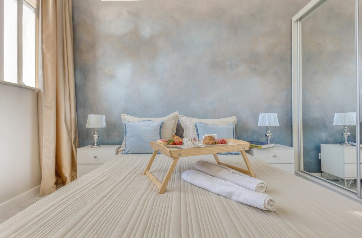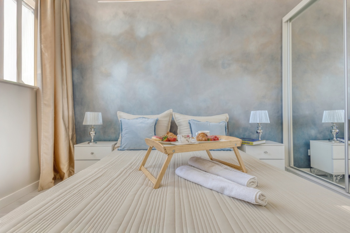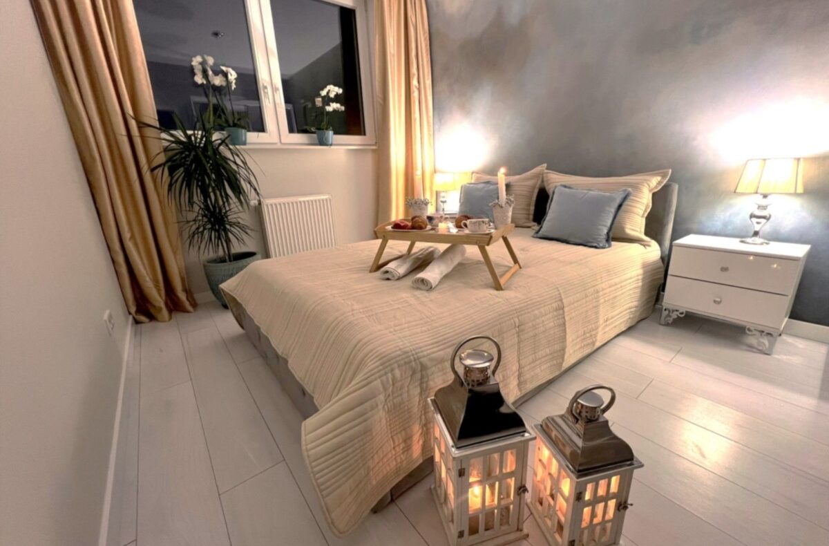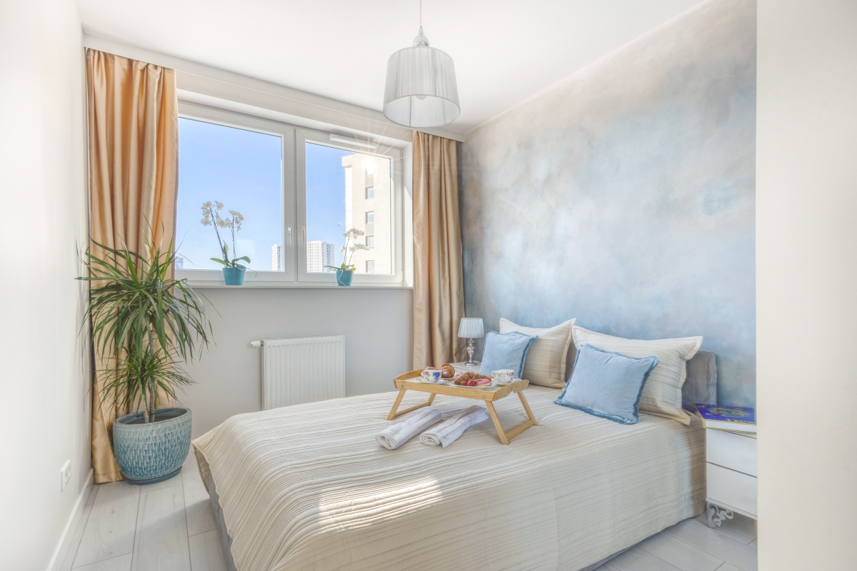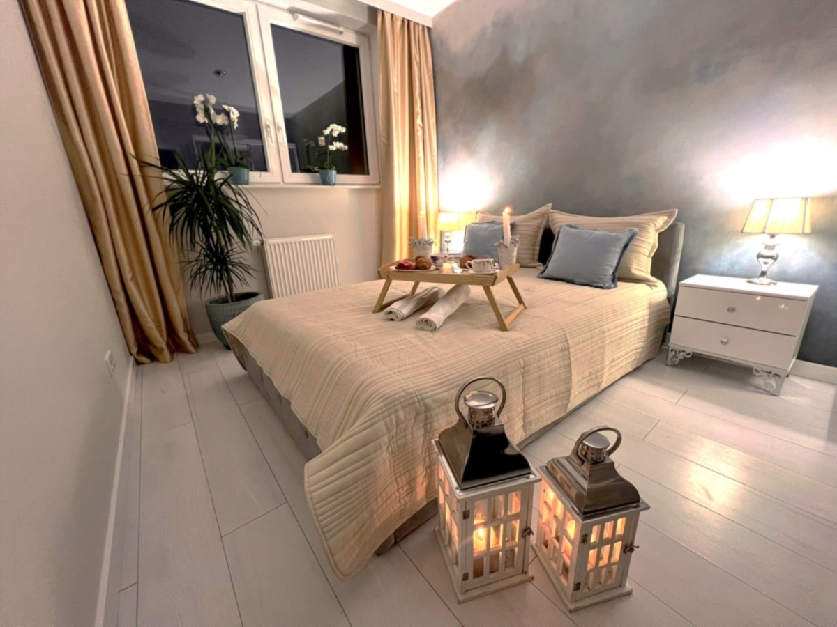 Skąpana w beżach i złocie sypialnia została wyposażona w welurowe łóżko z wygodnym oparciem oraz 2-drzwiową szafę z lustrzanymi drzwiami. Niepowtarzalny urok tego miejsca zapewnia ściana z artystycznym malowidłem wykonanym w technice ombre, inspirowana burzowym niebem, przez które przebijają się złote refleksy zachodzącego słońca. Uzupełnieniem tej kompozycji są utrzymane w barwach szarości i srebra lampki nocne ustawione na szafkach w stylu glamour z kryształowymi gałkami.