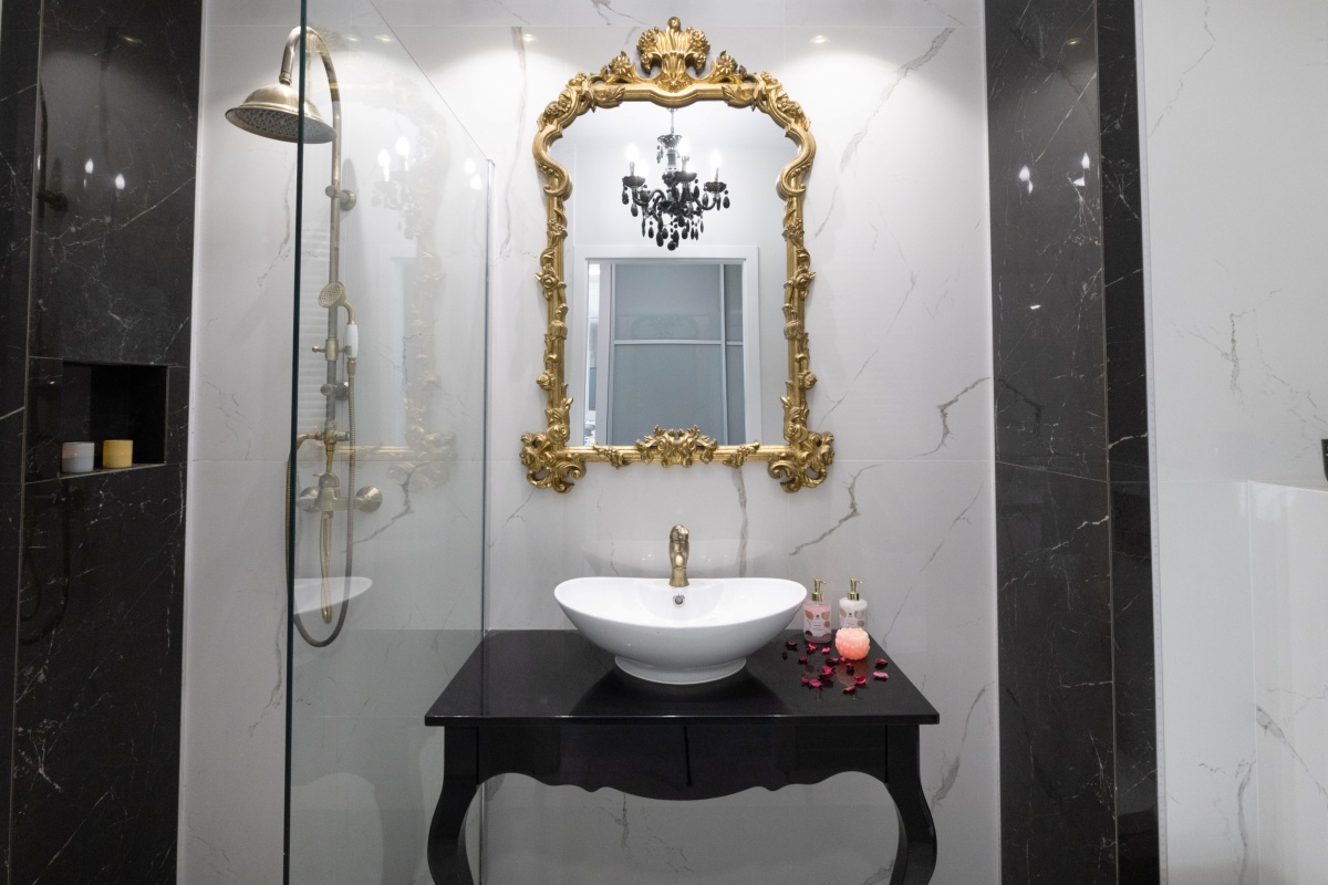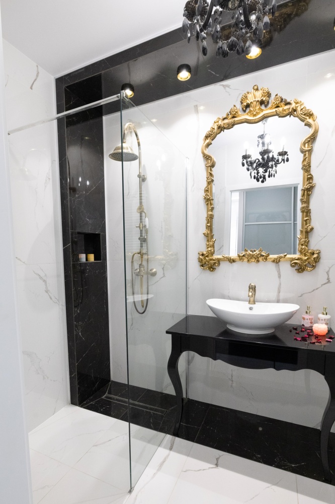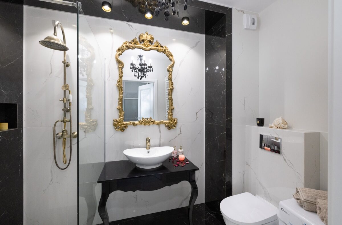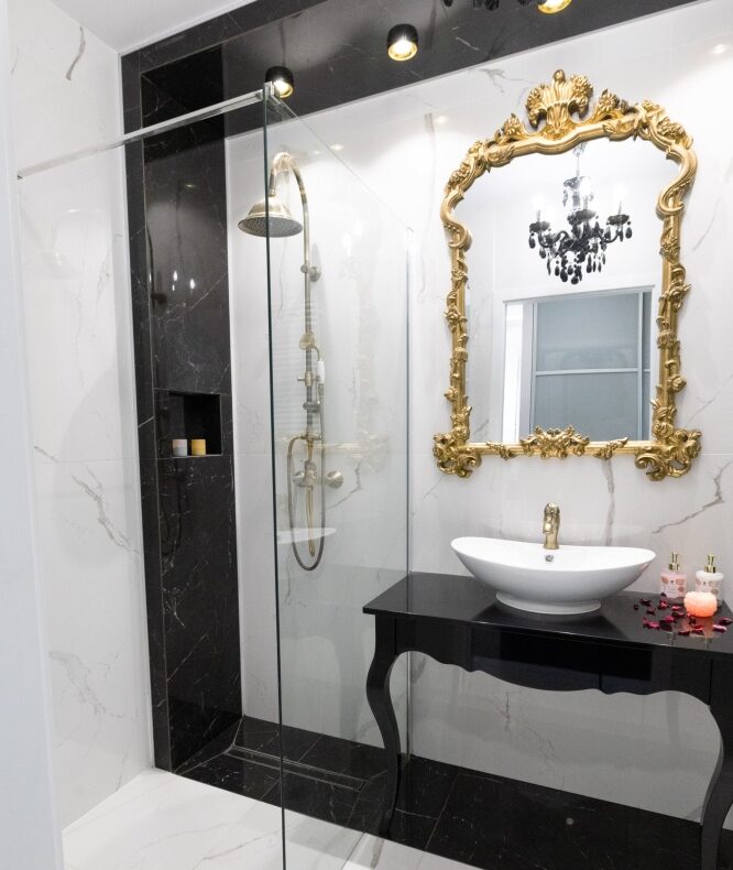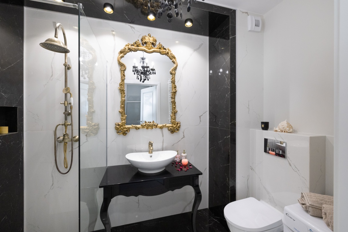 Blask i elegancja to cechy łazienki utrzymanej w barwach bieli i czerni przełamanej różnymi odcieniami złota. Komfort i wygodę zapewnia obszerna kabina prysznicowa osłonięta hartowaną szybą. Centralnym punktem kompozycji jest designerskie lustro, oprawione w złotą bogato zdobioną ramę, dominującą nad białą umywalką osadzoną na czarnej konsoli.