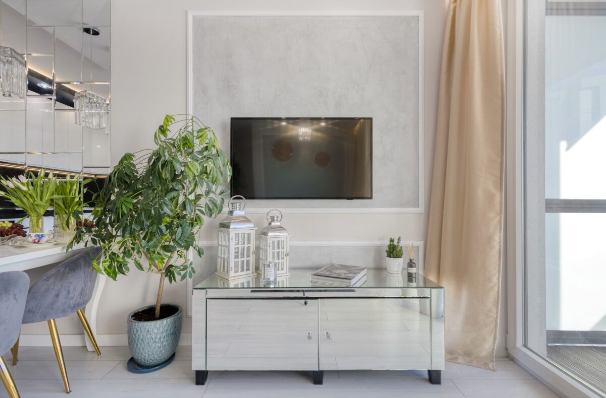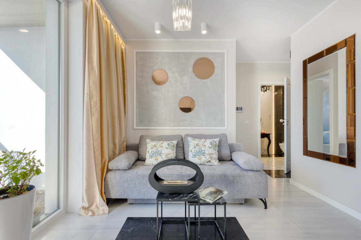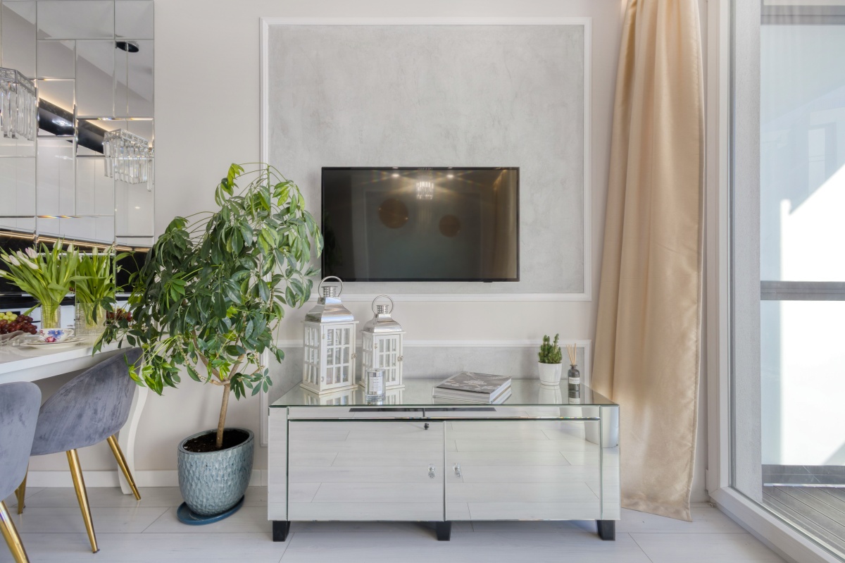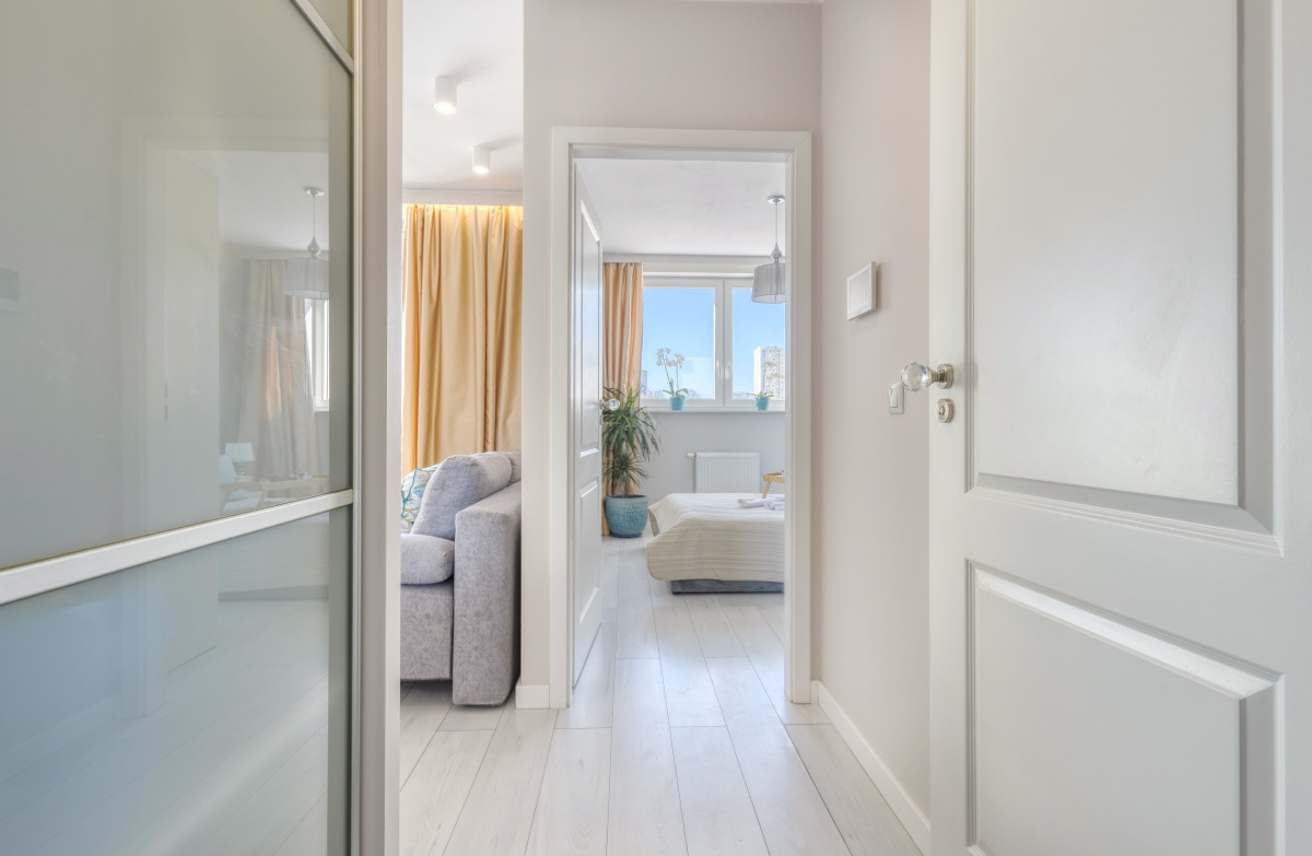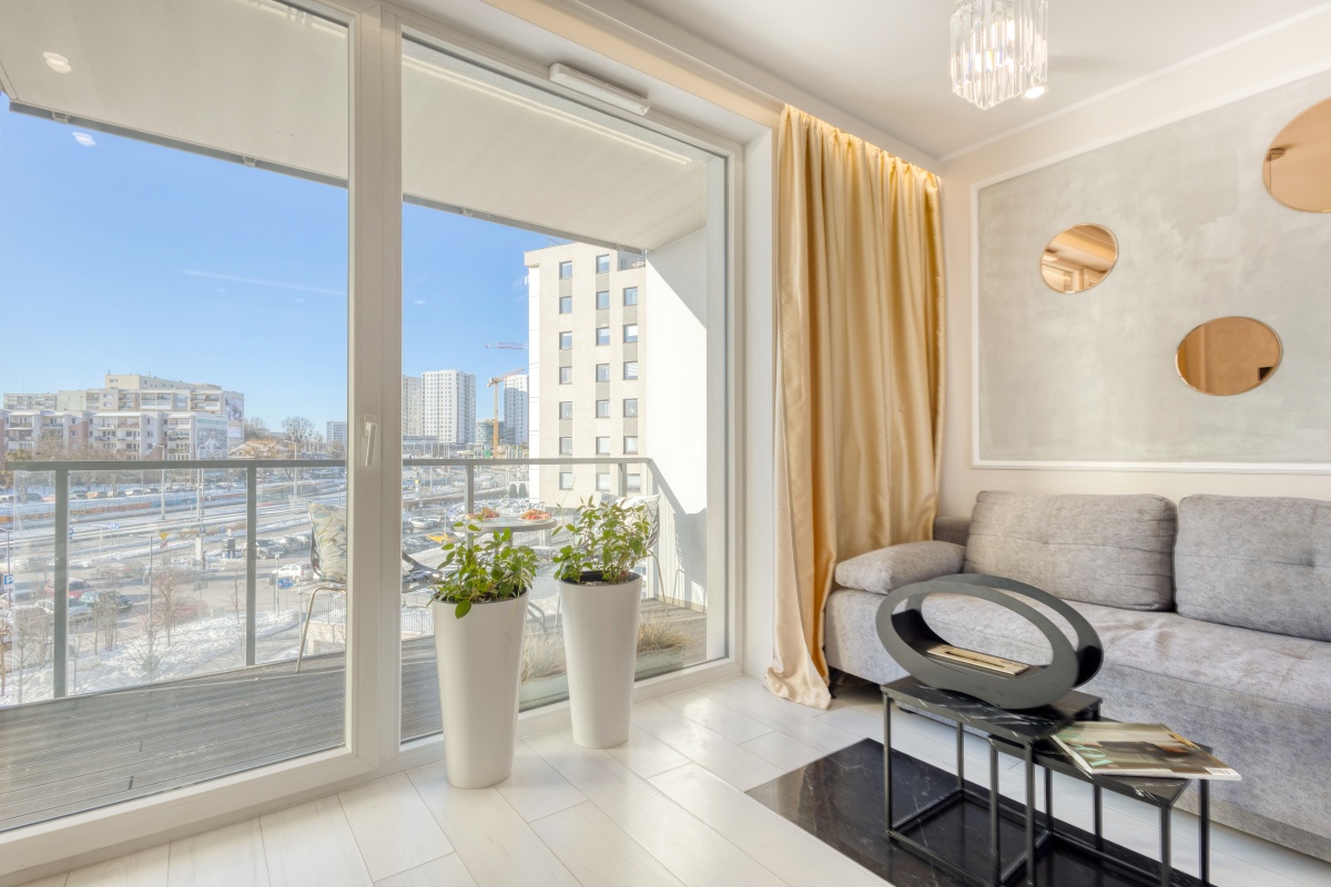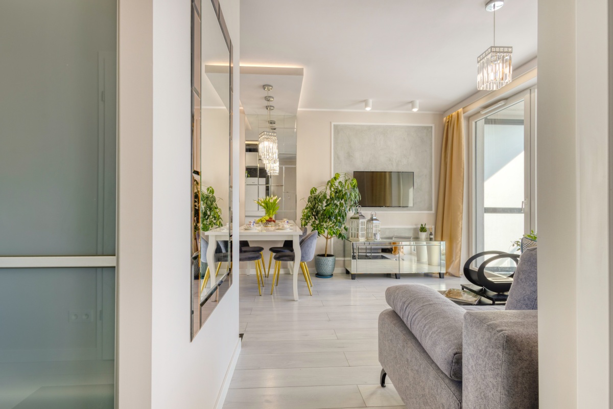 Oferowane mieszkanie otwiera przedpokój, którego atutem jest obszerna szafa wnękowa, dyskretnie ukryta za przesuwanymi drzwiami z mlecznego szkła. Przedpokój zaprasza do eleganckiego i dobrze doświetlonego salonu oraz przytulnej sypialni i stylowej łazienki. Od razu widać, iż we wnętrzu rządzi stonowana i delikatnie zróżnicowana kolorystyka, z dominującym beżem ścian, szarością betonów i tkanin, bielą mebli, co w połączeniu z kryształowymi i złotymi dodatkami inspirowanymi stylem glamour stało się znakiem rozpoznawczymi mieszkania.