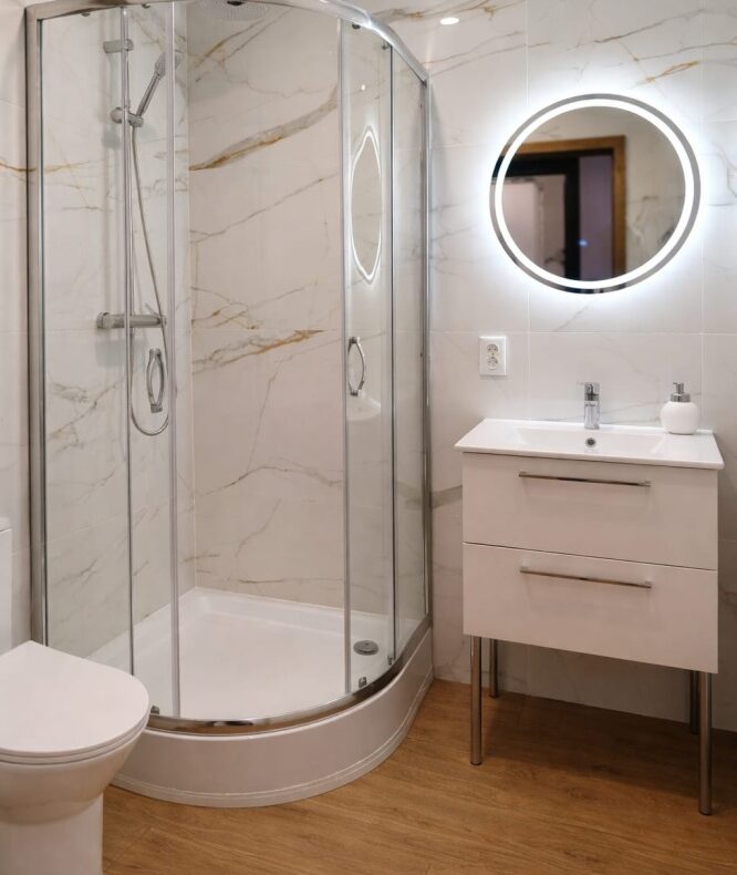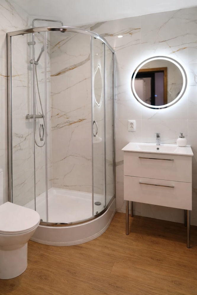 łazienka wyposażona w Wc, szafkę z umywalką, lustro, brodzik, deszczownicę z baterią