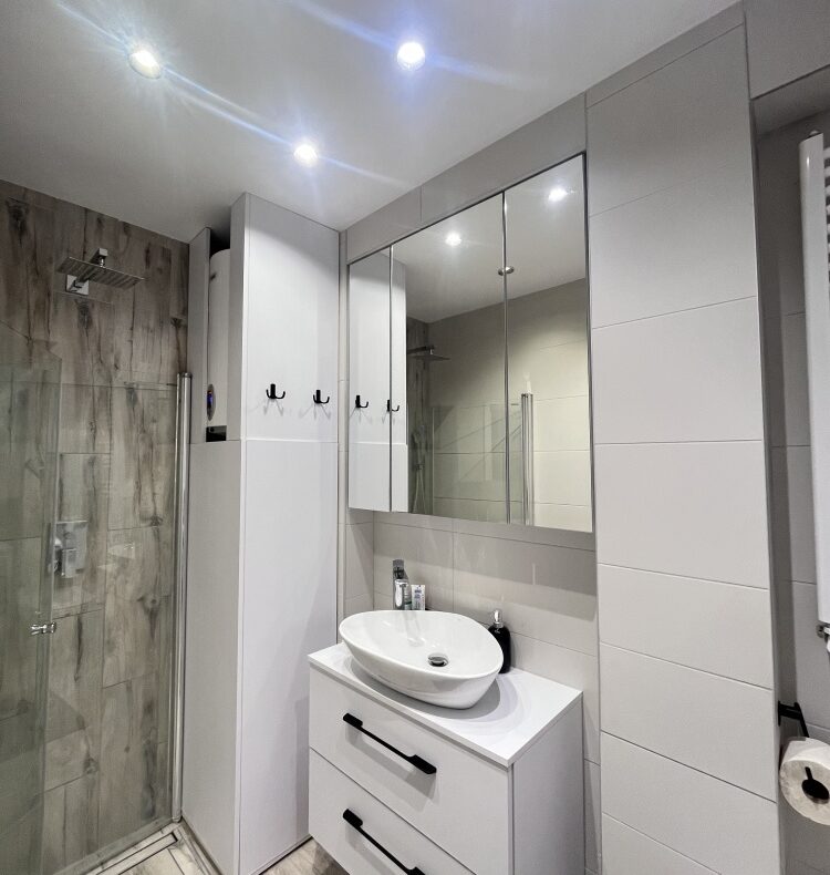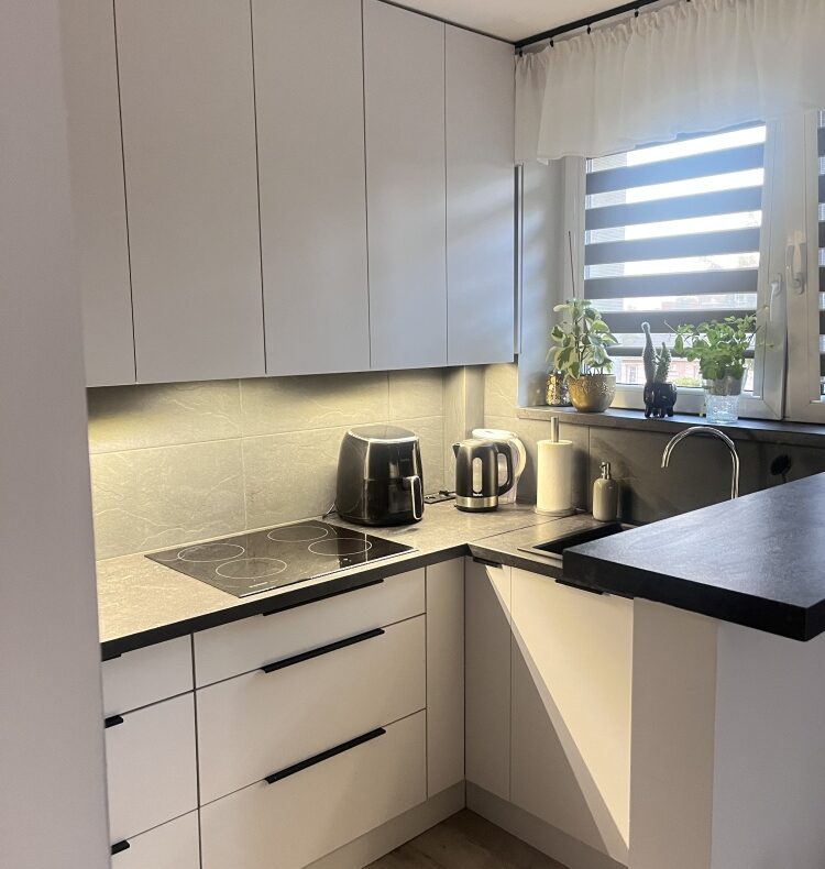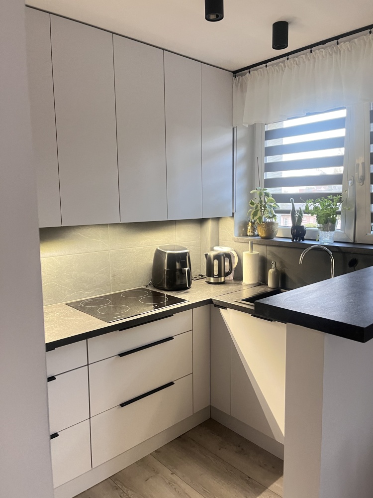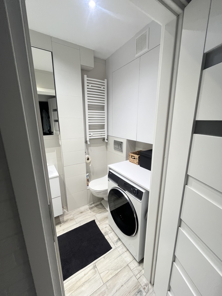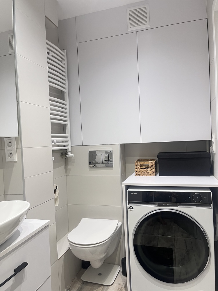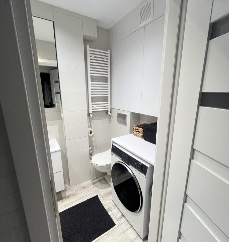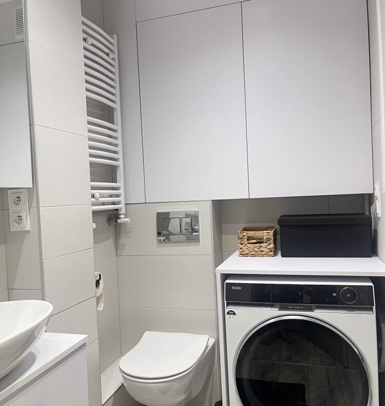 Sprzęt AGD: lodówka, pralko-suszarka, piekarnik, płyta indukcyjna, mikrofalówka, zmywarka w zabudowie, bojler w łazience