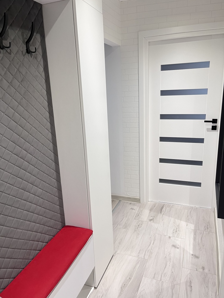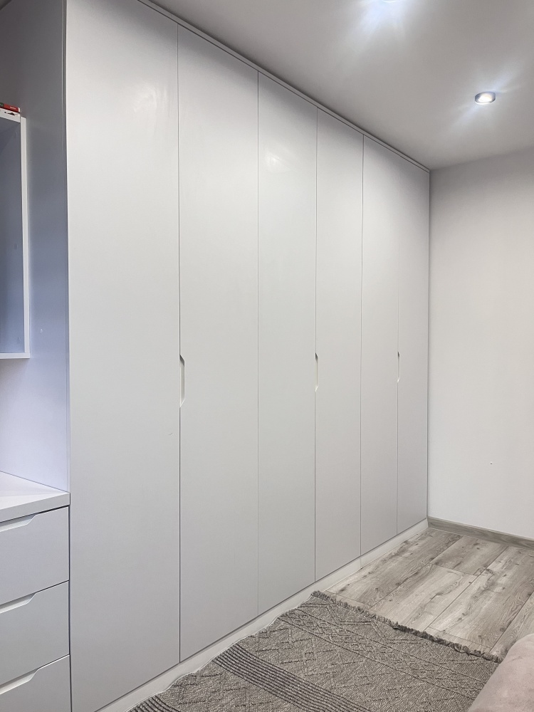 Meble: zabudowa kuchenna, szafa w zabudowie w pokoju, komoda, sofa, szafki w łazience w zabudowie