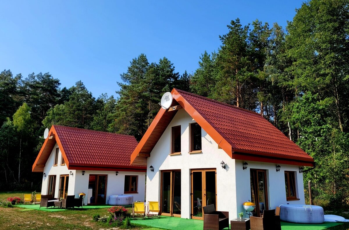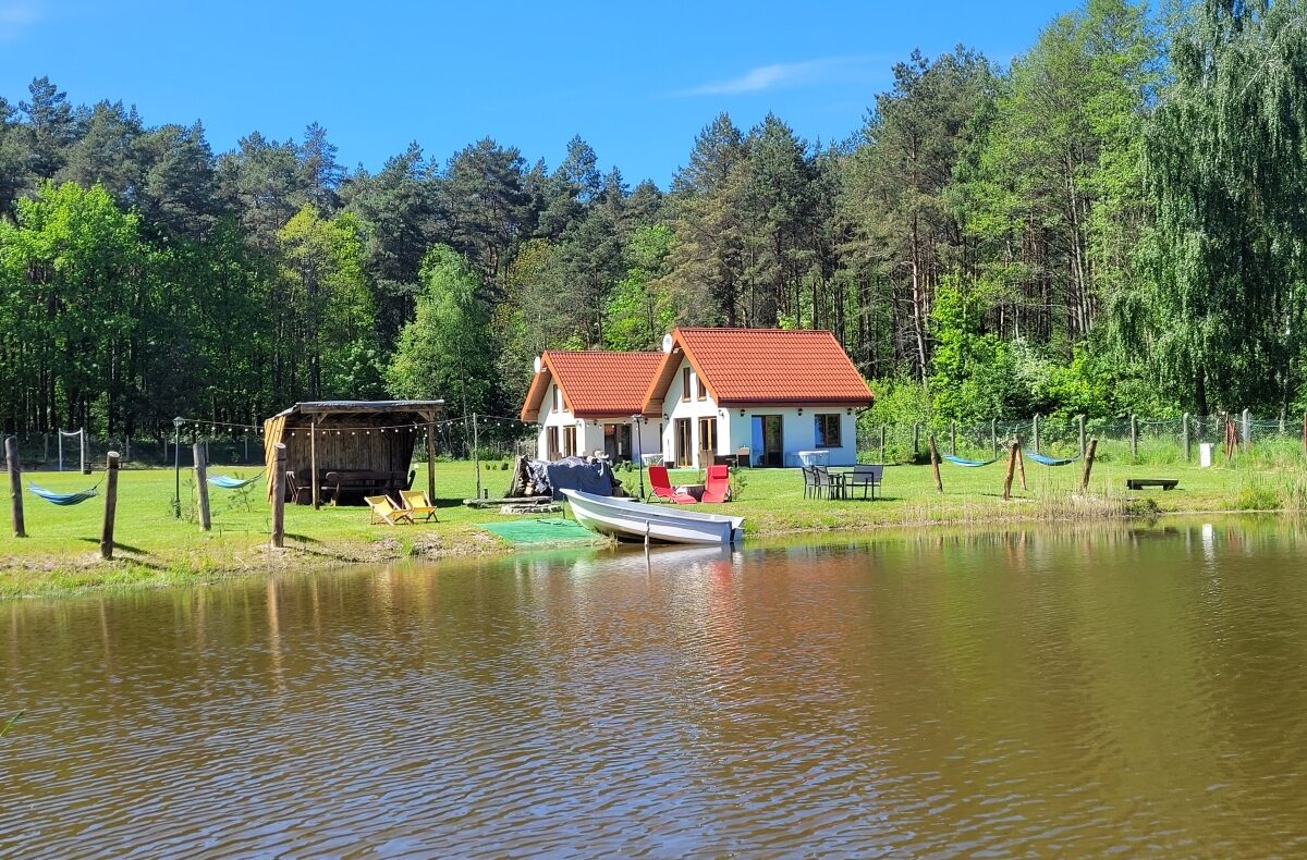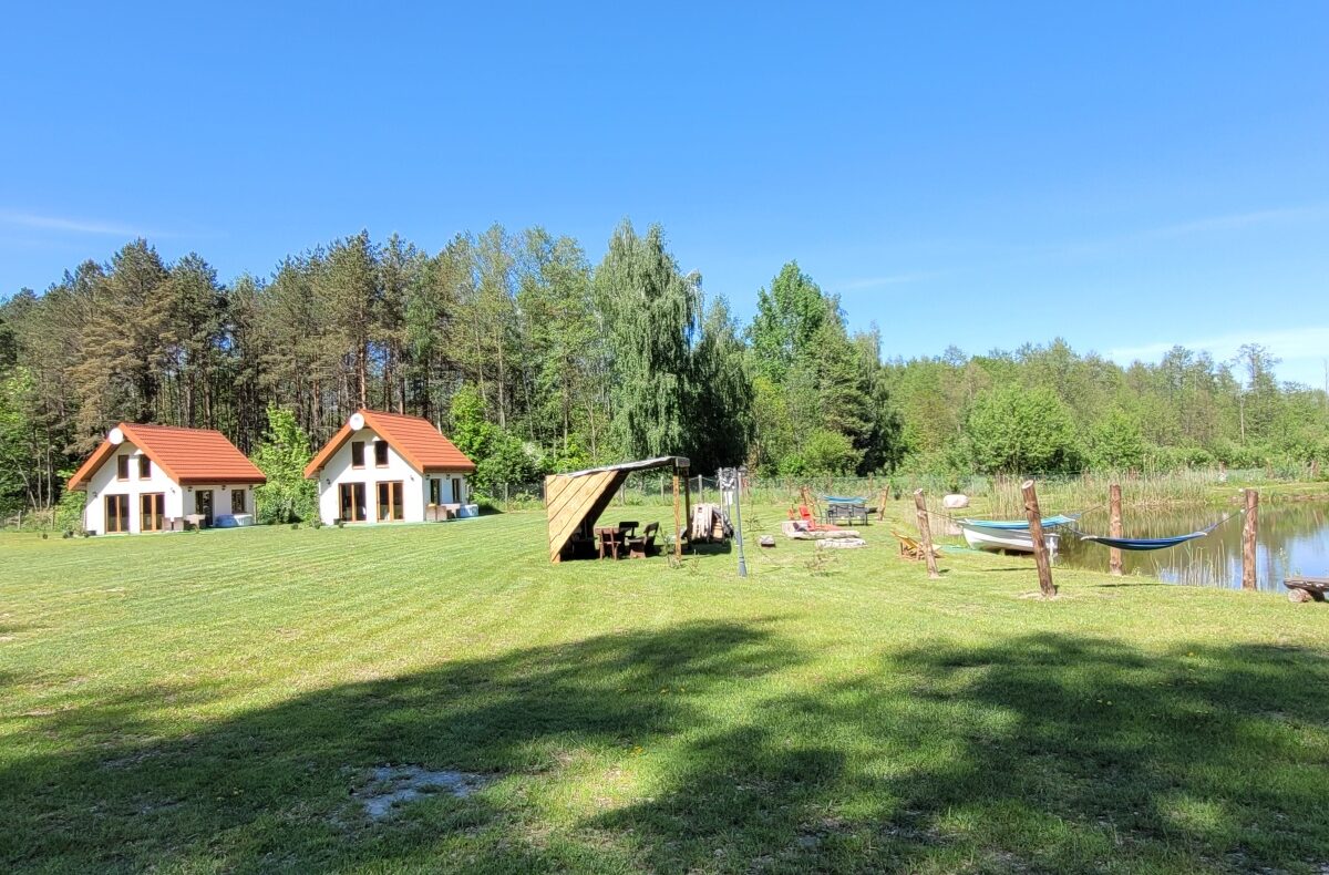 Po jednej stronie stawu znajduje się opisany wyżej dom mieszkalny wraz z garażami, a po drugiej stronie stoją dwa domki caloroczne o powierzchni zabudowy 35m² każdy, obydwa wybudowane w 2023. Powierzchnia po podłodze każdego domku wynosi ok 40m². Są to dwa identyczne domki, murowane i ocieplone z antresolą, wykończone w wysokim standardzie. Kazdy z domków: salon z aneksem kuchennym, łazienka, sypialnia + druga sypialnia na antresoli.