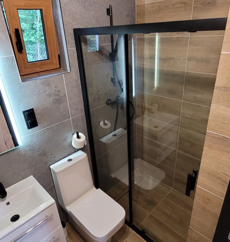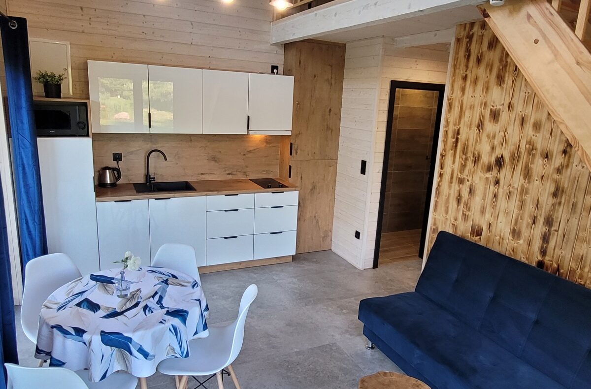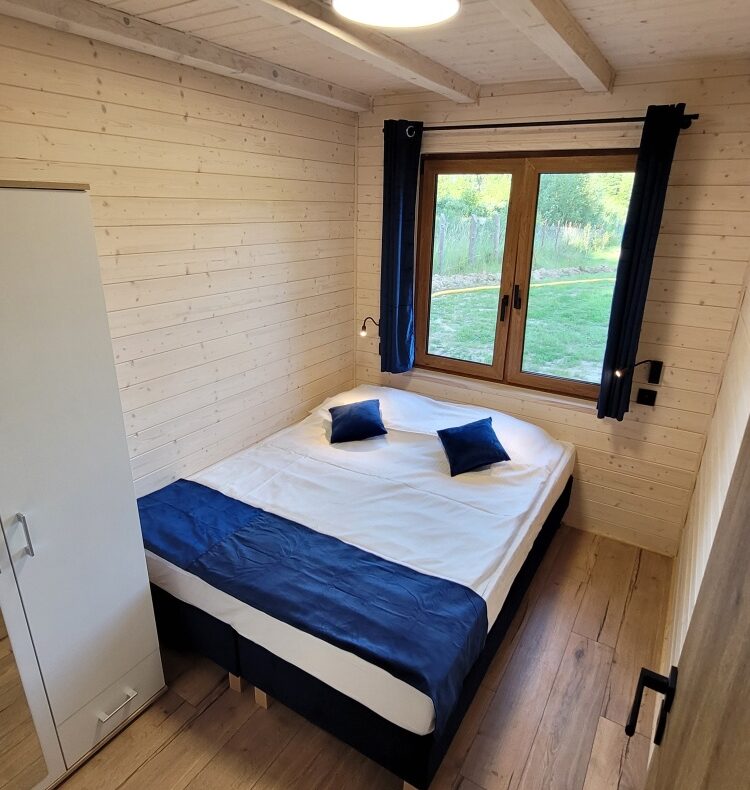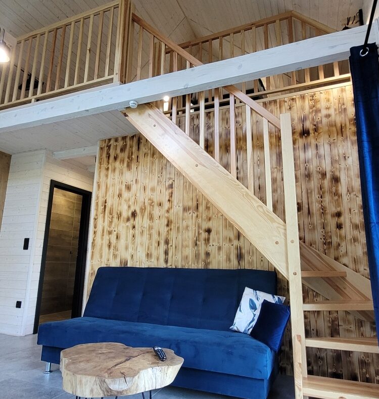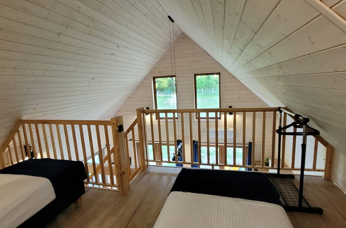 Po jednej stronie stawu znajduje się opisany wyżej dom mieszkalny wraz z garażami, a po drugiej stronie stoją dwa domki caloroczne o powierzchni zabudowy 35m² każdy, obydwa wybudowane w 2023. Powierzchnia po podłodze każdego domku wynosi ok 40m². Są to dwa identyczne domki, murowane i ocieplone z antresolą, wykończone w wysokim standardzie. Kazdy z domków: salon z aneksem kuchennym, łazienka, sypialnia + druga sypialnia na antresoli.