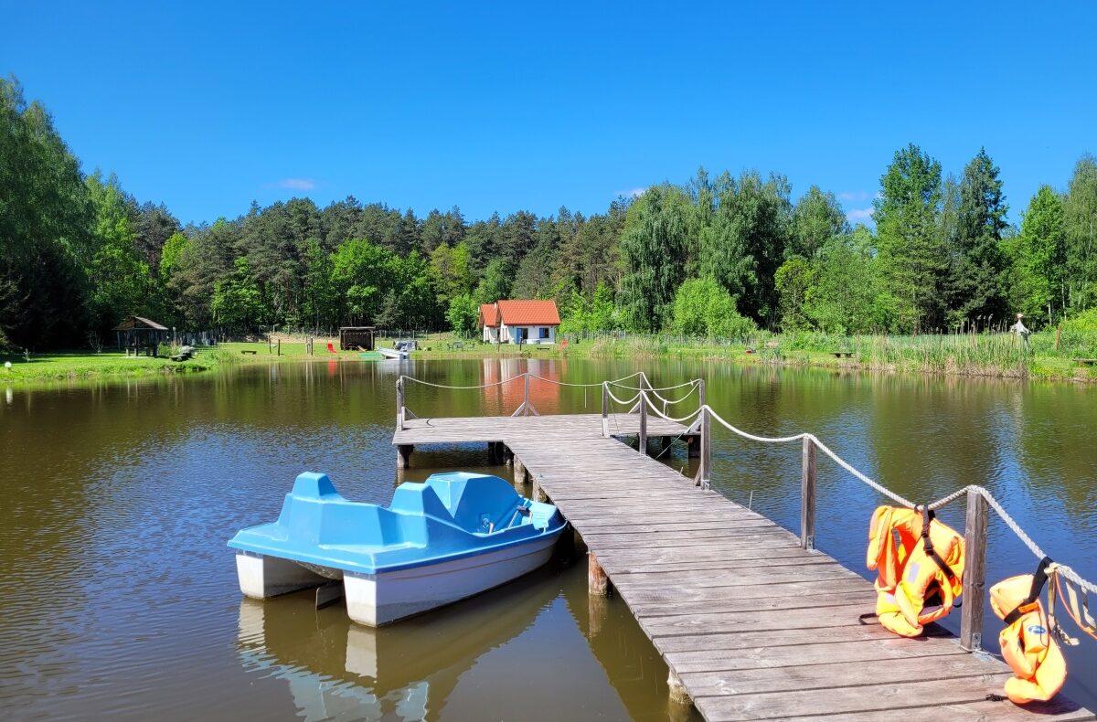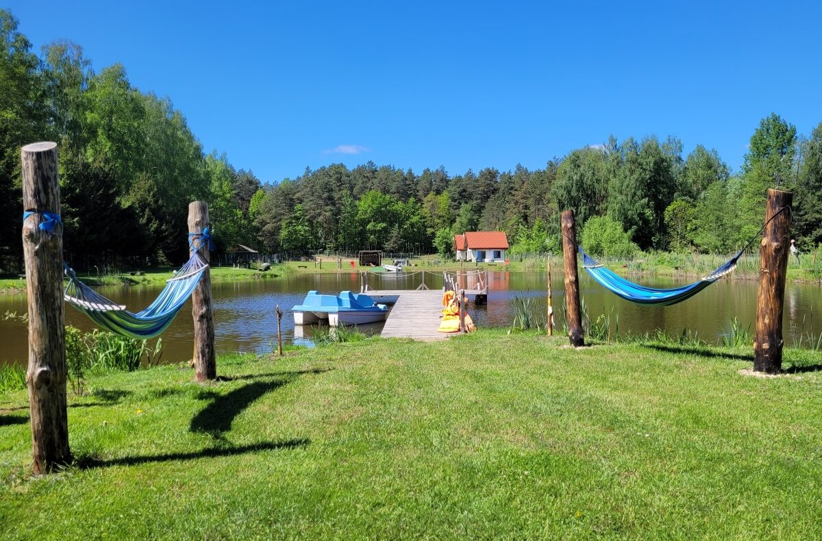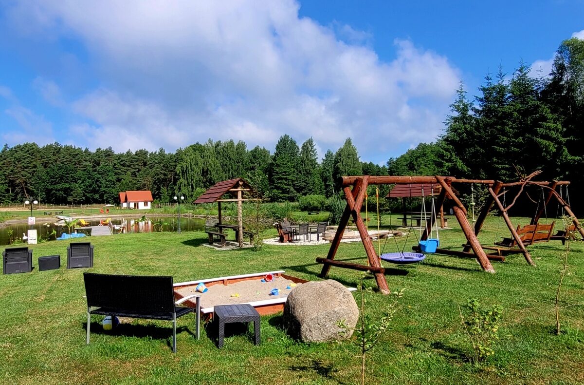 Na działce znajduje się mały plac zabaw, parę hamaków, są 2 miejsca na ognisko, a na stawie znajduje się pomost, z którego można łowić ryby i to bez żadnych ograniczeń i pozwoleń:). Dodatkowo na działce namiot 6m x 12m z ping-pongiem, minibilardem i pilkarzykami. We wrześniu 2025 zakupiona balia na drewno z hydromasażem. Działka jest ogrodzona, a wzdłuż płotu rosną częściowo duże świerki oraz kilka mniejszych świerków, tuj i innych drzewek również owocowych i krzaków zasadzonych w ostatnich latach.