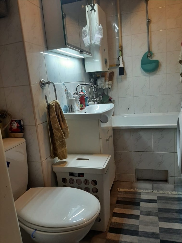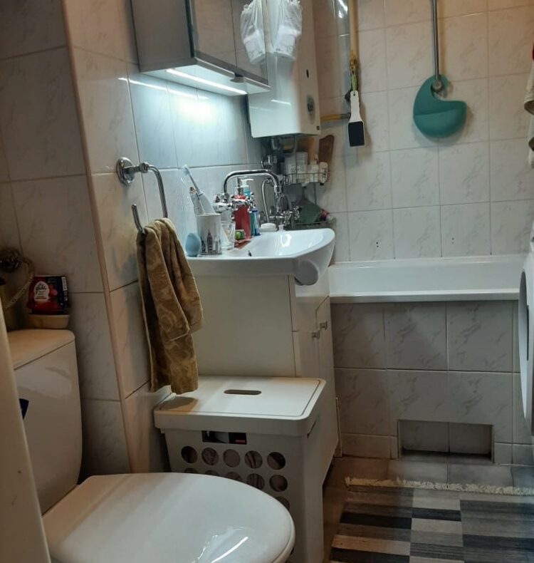 – łazienka z toaletą, wanną, pralką i zabudową szaf