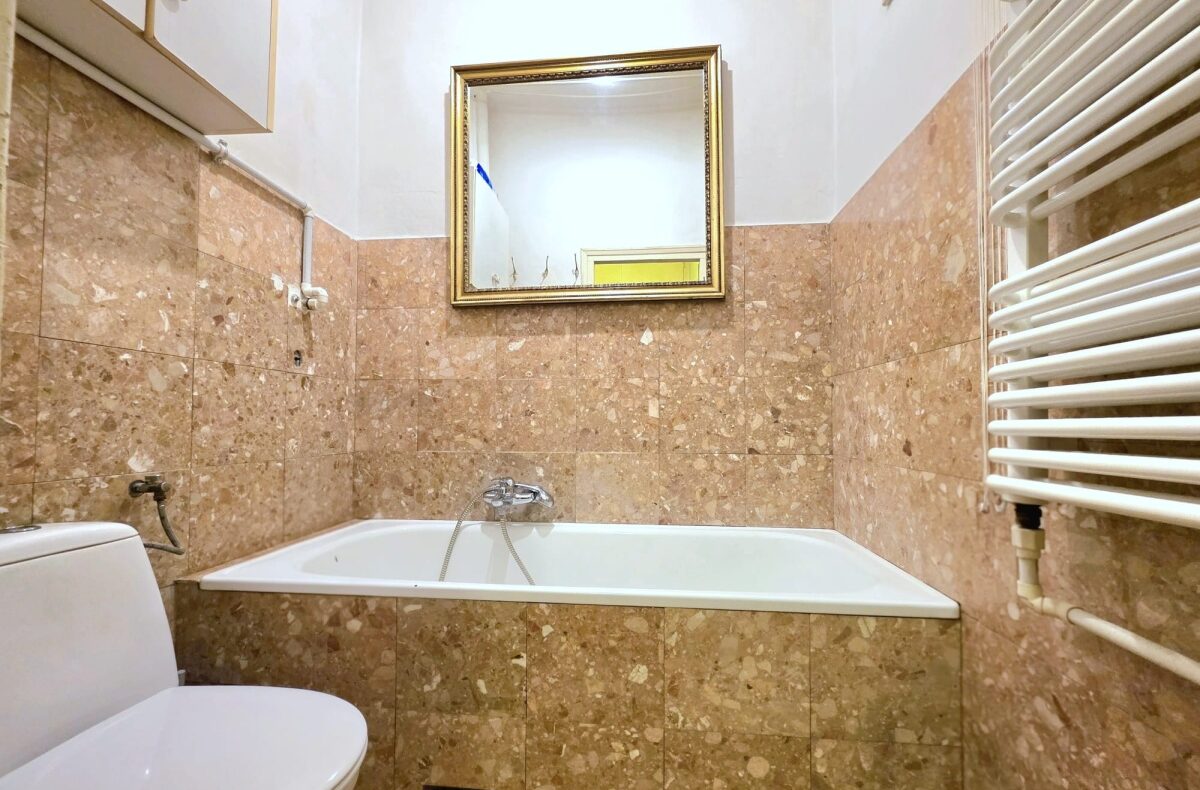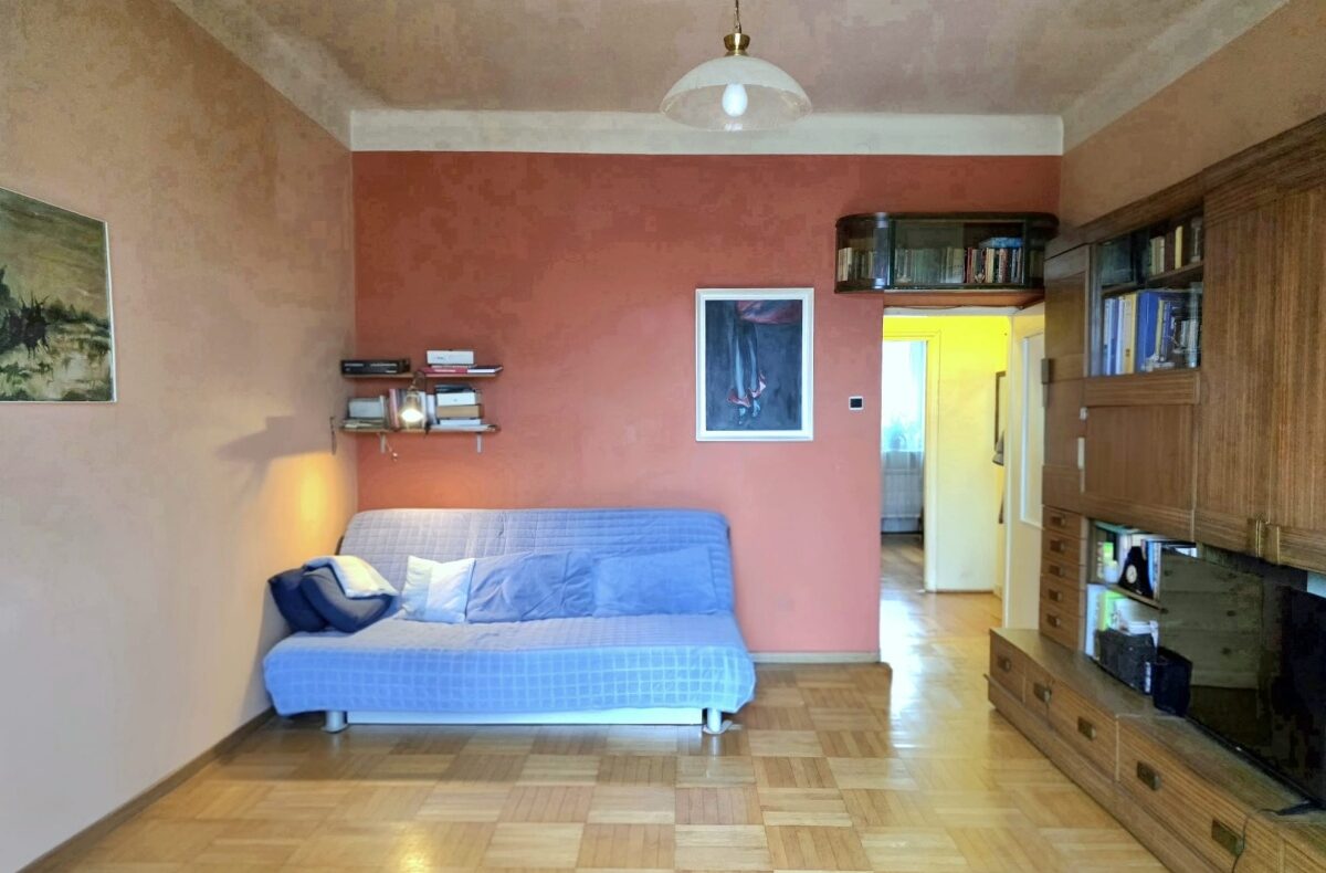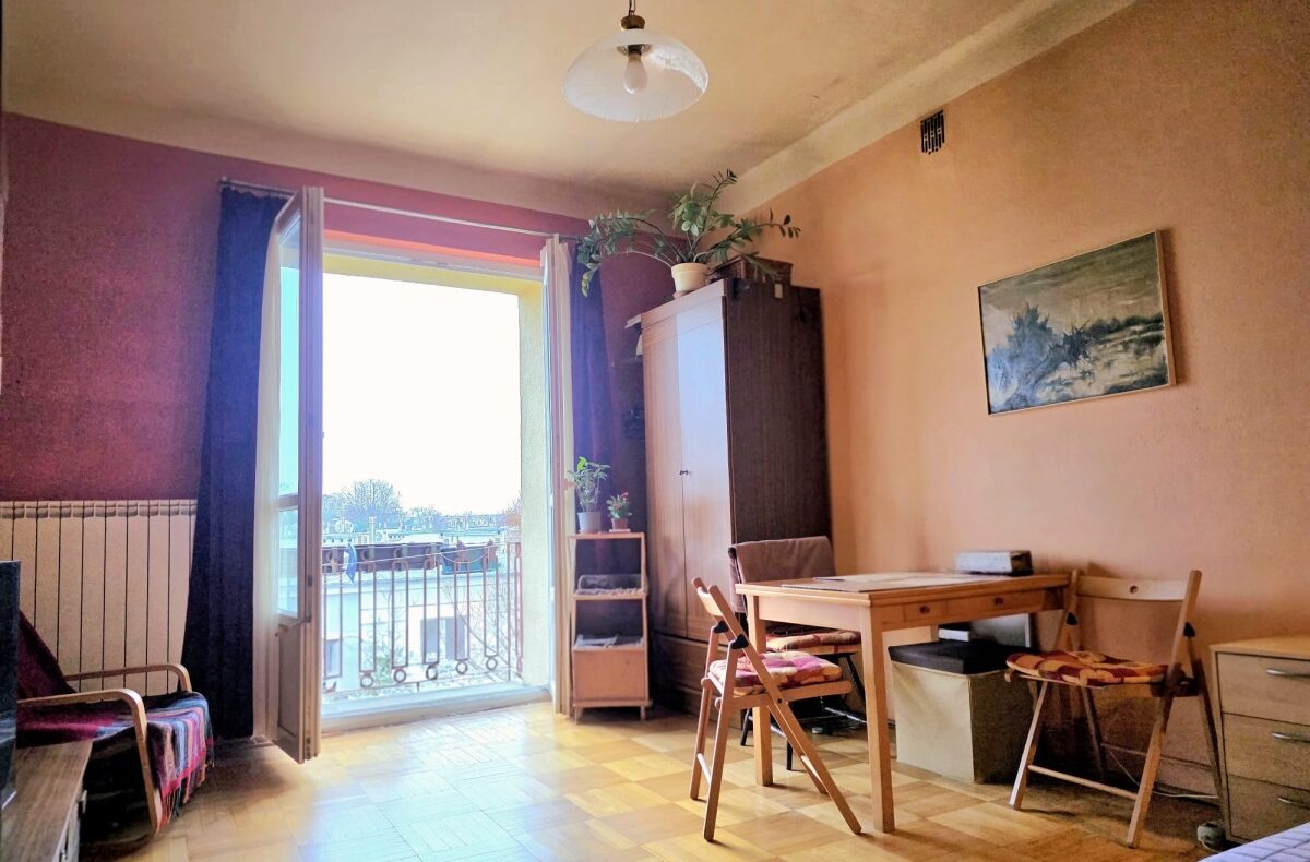 Wysokie wnętrze daje poczucie przestronności, duże okna z ekspozycją wschód-zachód zapewniają dobre doświetlenie. Stan mieszkania – do remontu.