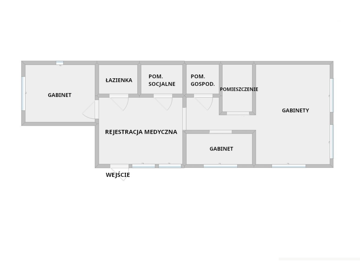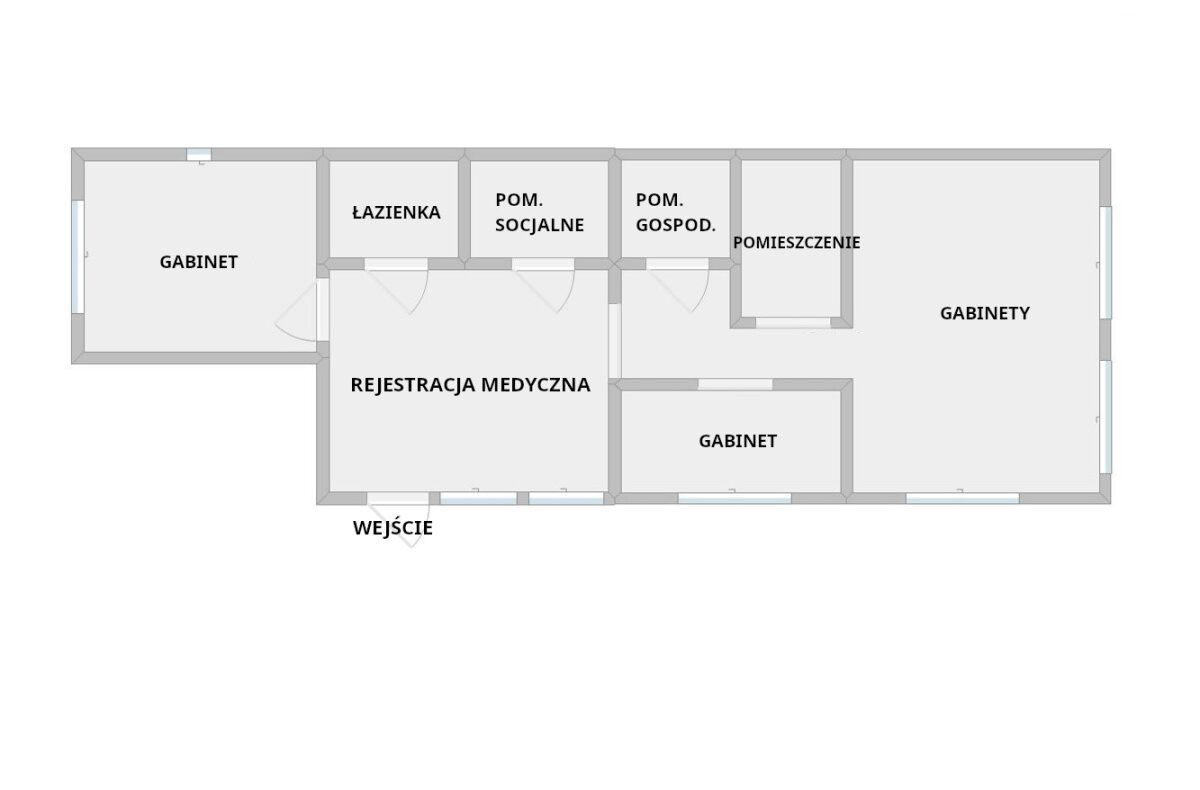 Lokal składa się z trzech gabinetów, osobnego pomieszczenia, pomieszczenia gospodarczego, łazienki oraz korytarza. W cenie jest udział w części wspólnych jak rejestracja medyczna, pomieszczenie socjalne oraz łazienka.