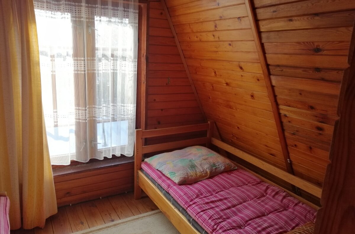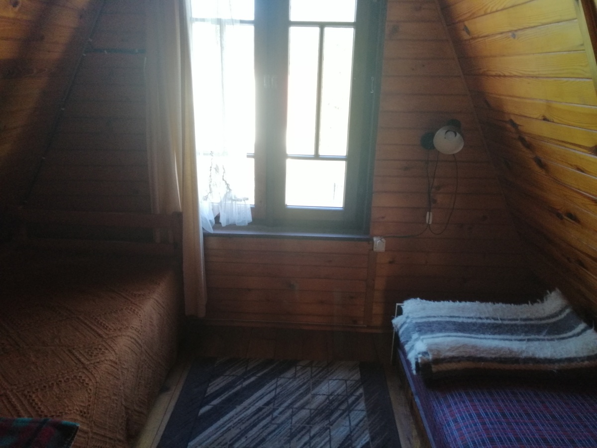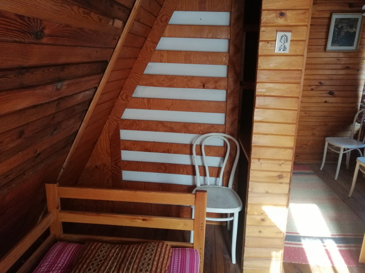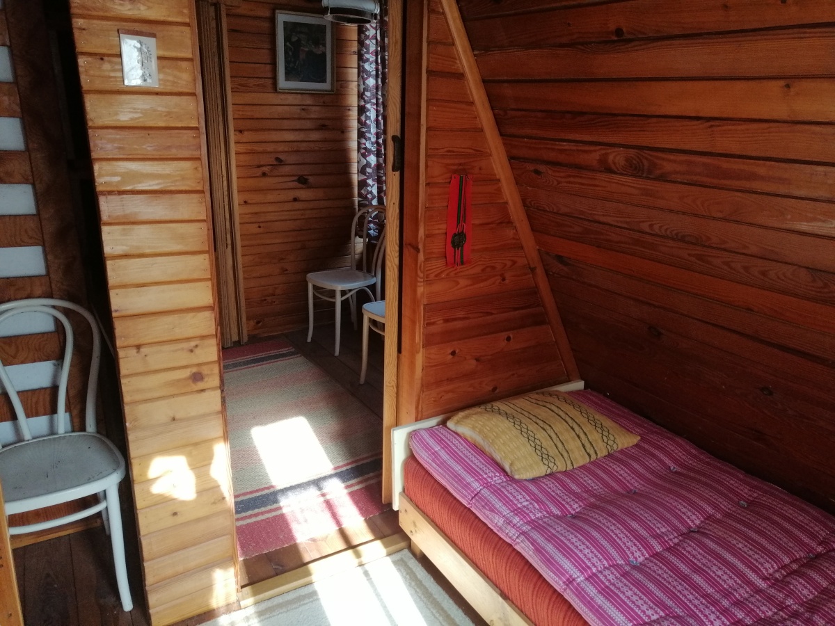 Piętro: 2 sypialnie po 2 tapczaniki i miejsce na stolik z widokiem na jezioro lub tapczanik.