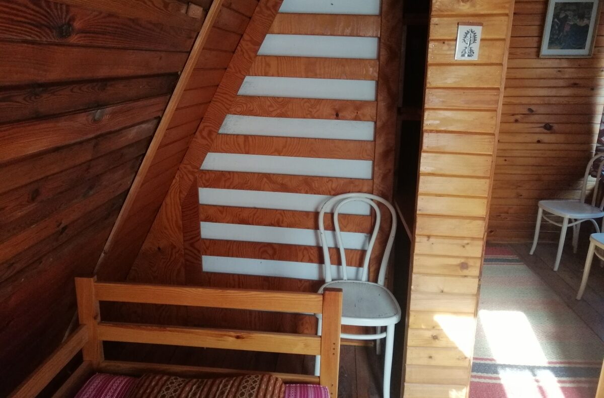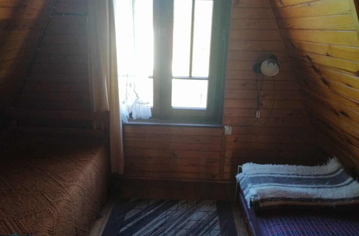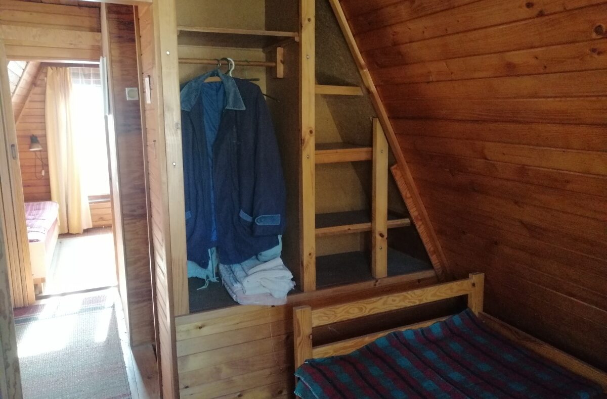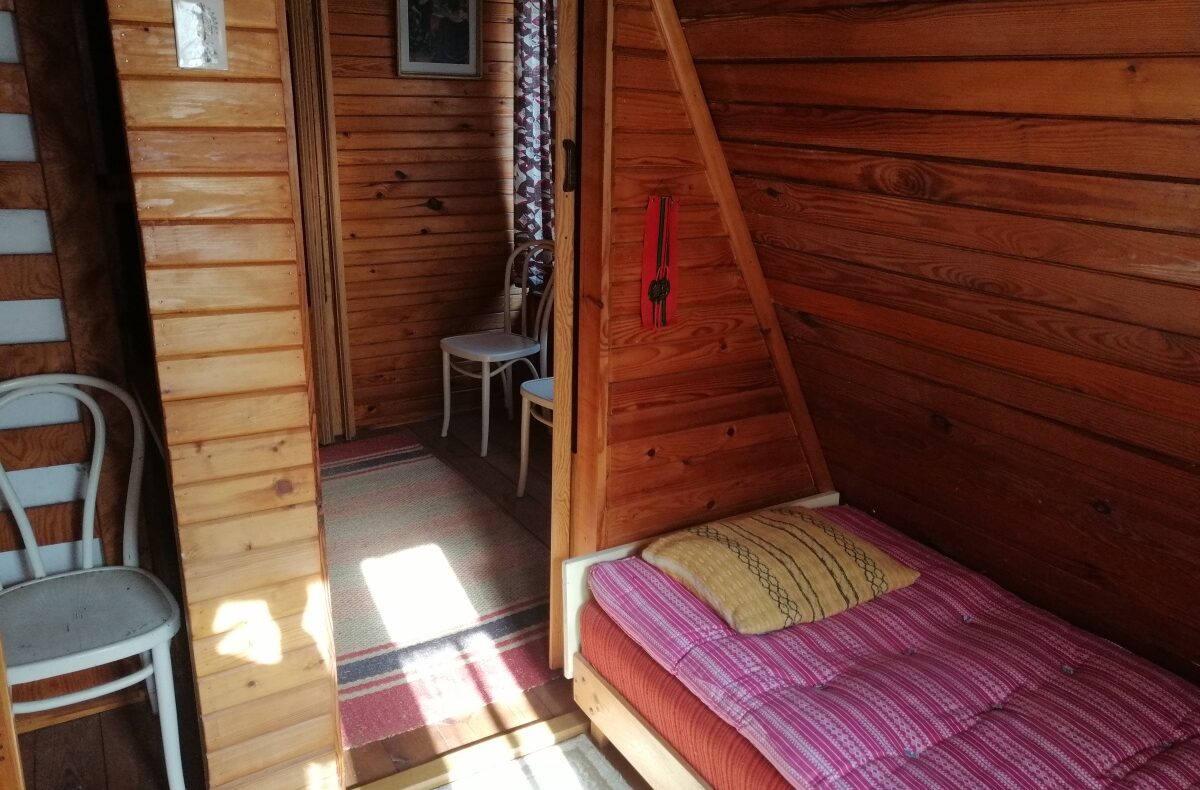 Piętro: 2 sypialnie po 2 tapczaniki i miejsce na stolik z widokiem na jezioro lub tapczanik.