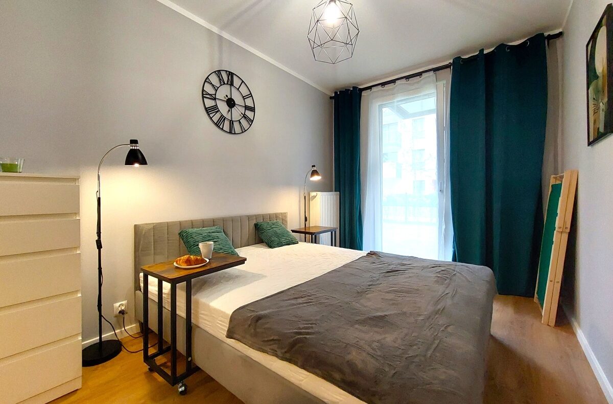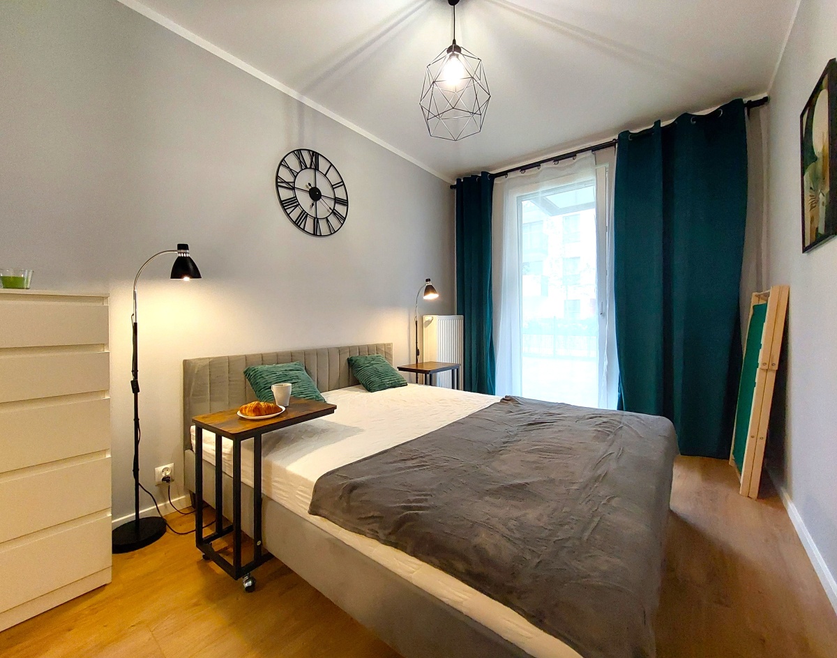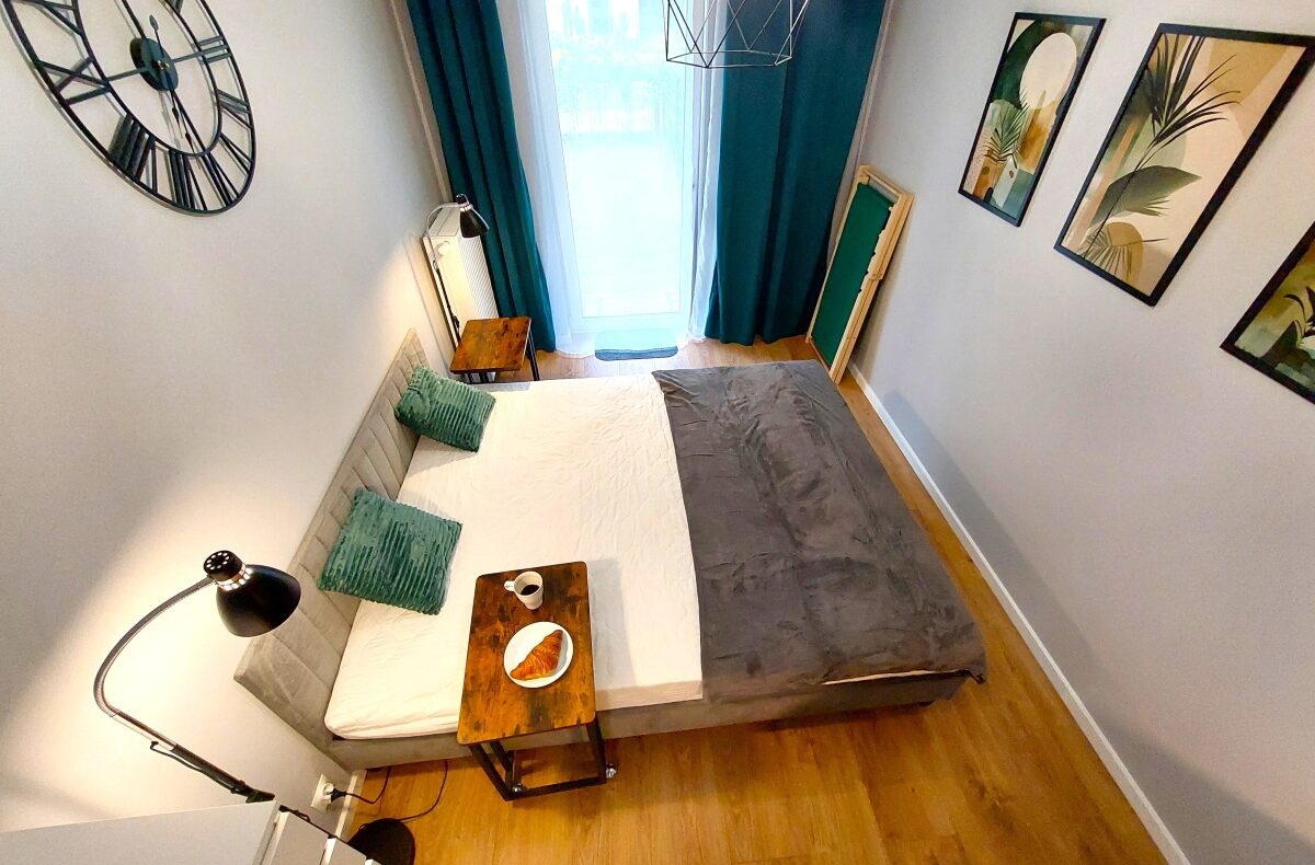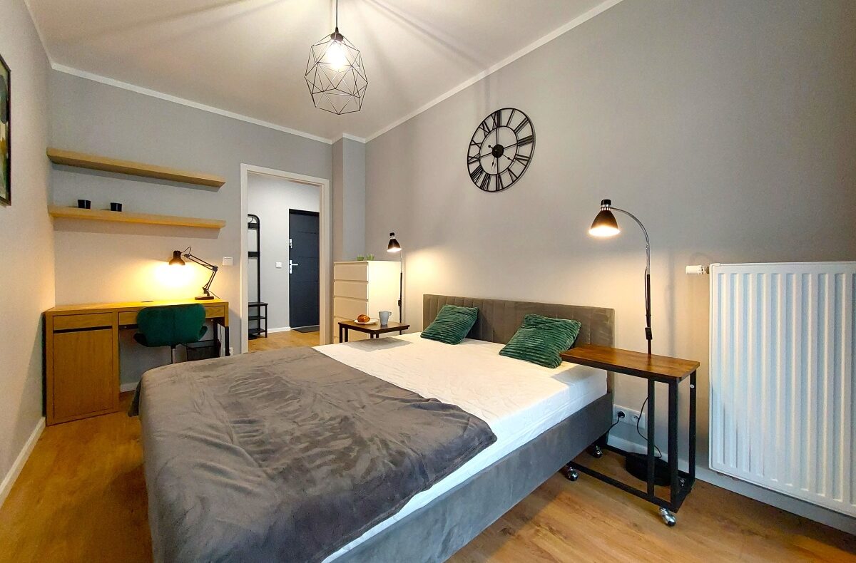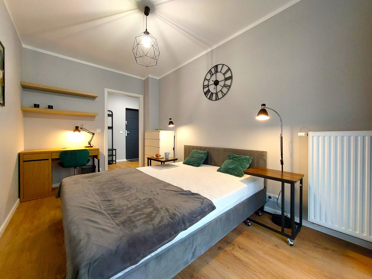 Sypialnia z dużym łóżkiem (160×200), biurko do pracy zdalnej z dodatkowym wyjściem na ogródek