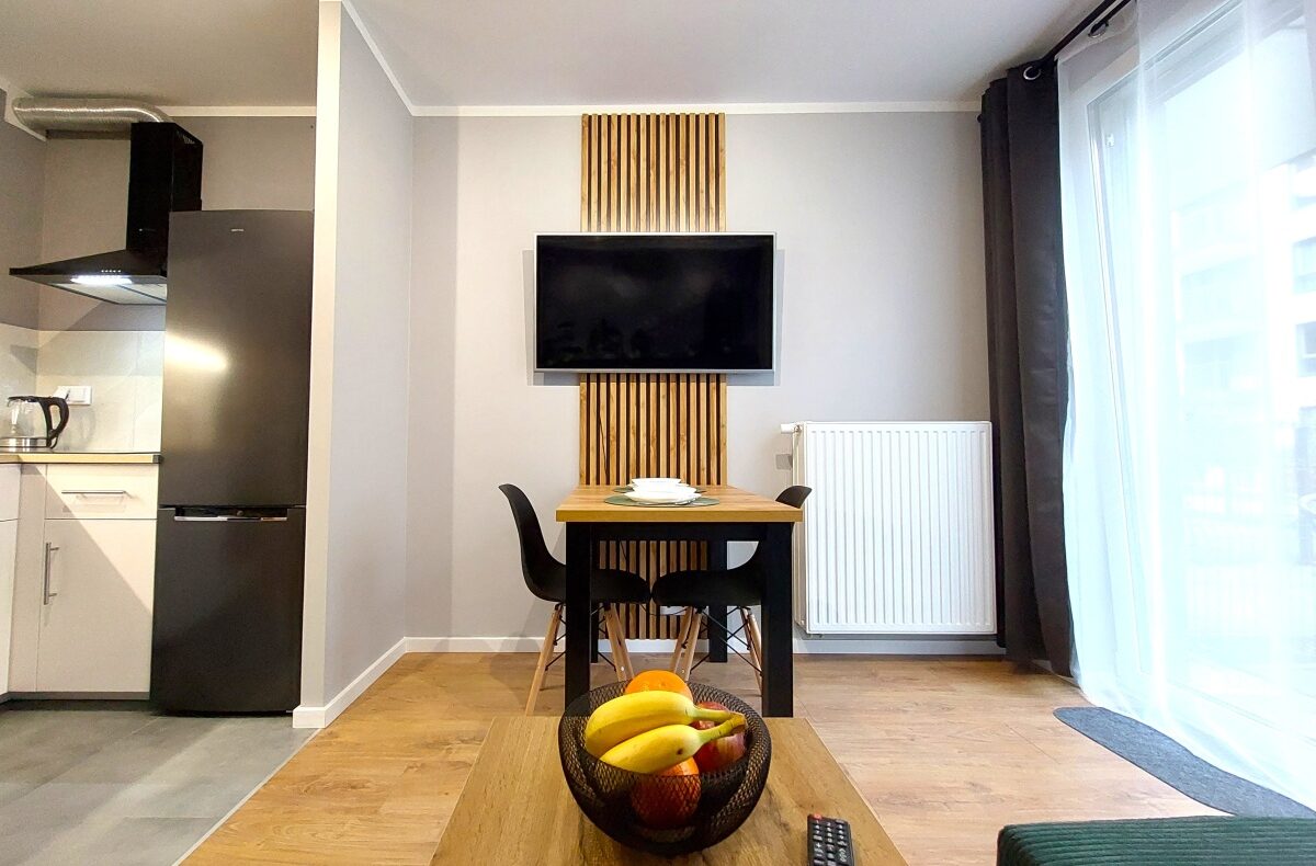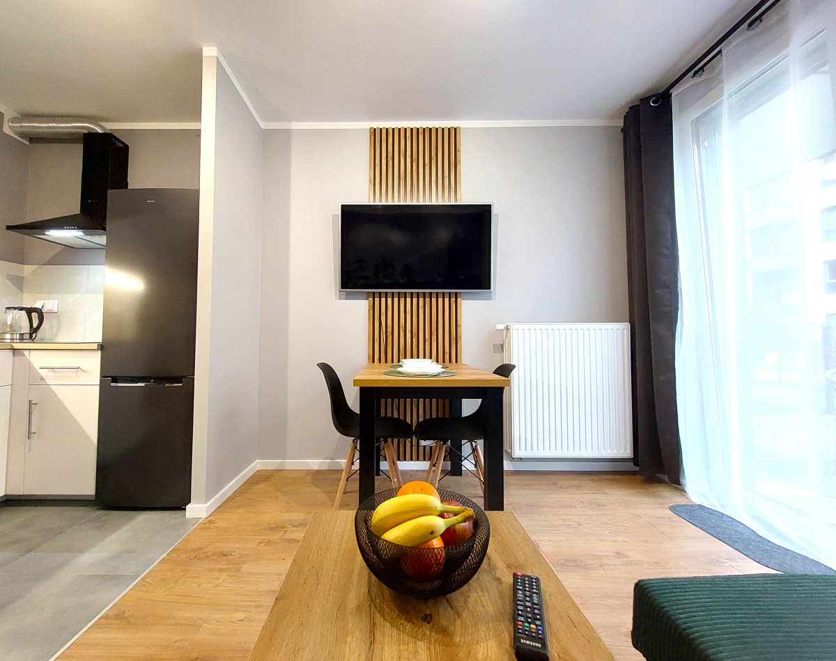 Salon z aneksem kuchennym – duży TV na ścianie, narożnik z funkcją spania oraz stół kuchenny