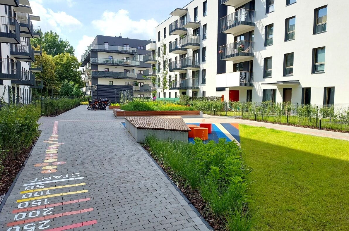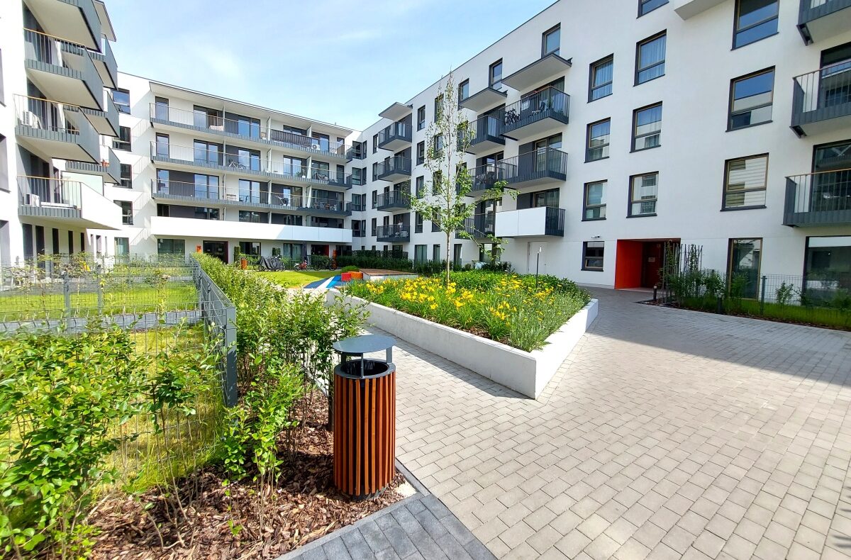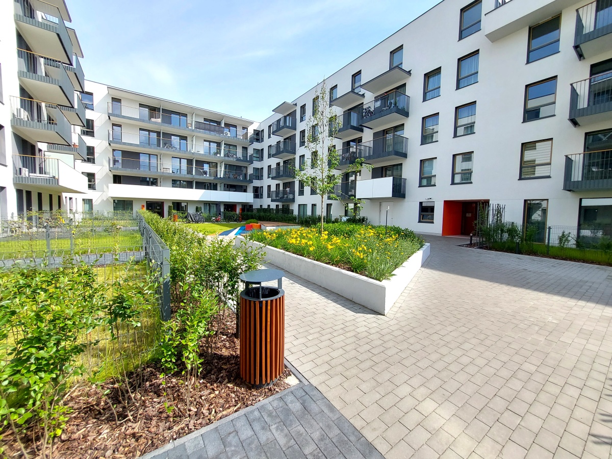 Nowe osiedle, teren zamknięty z ochroną, wewnętrzne patio ze stojakami na rowery i strefą wypoczynkową.