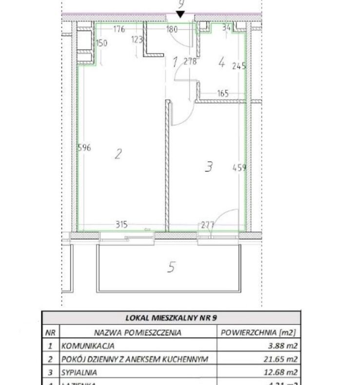 Pokój dzienny z aneksem kuchennym – 21,65 m²
