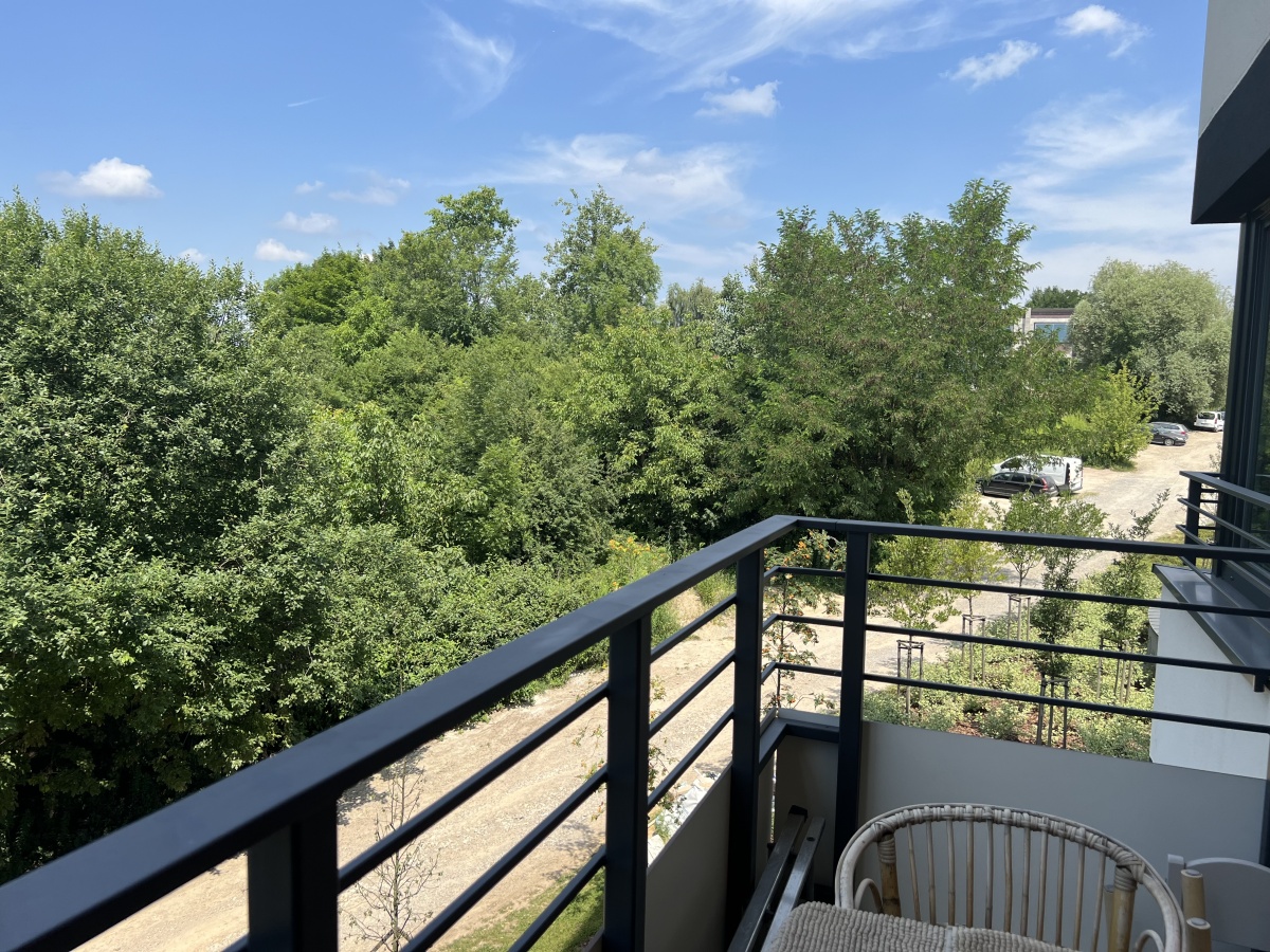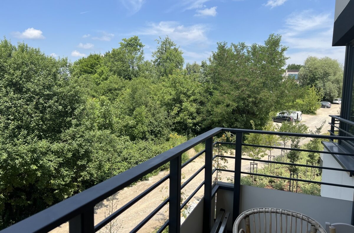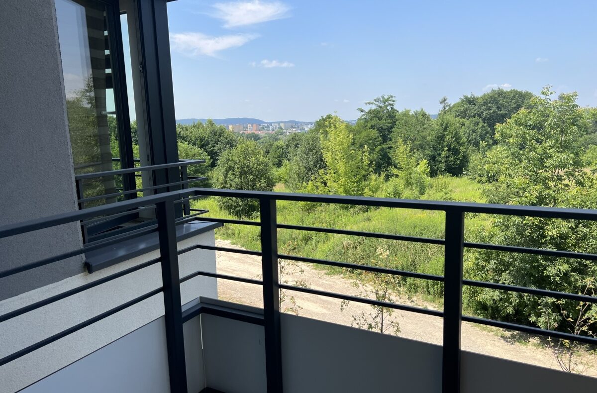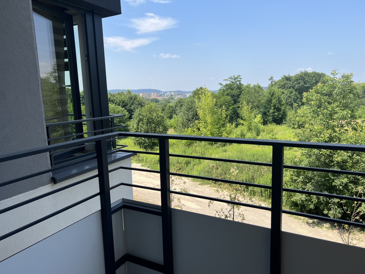 Z balkonu mieszkania rozpościera się przyjemny widok na okoliczna zieleń.