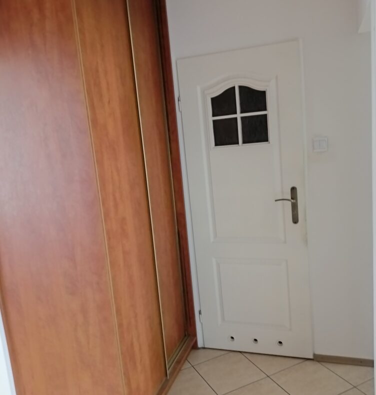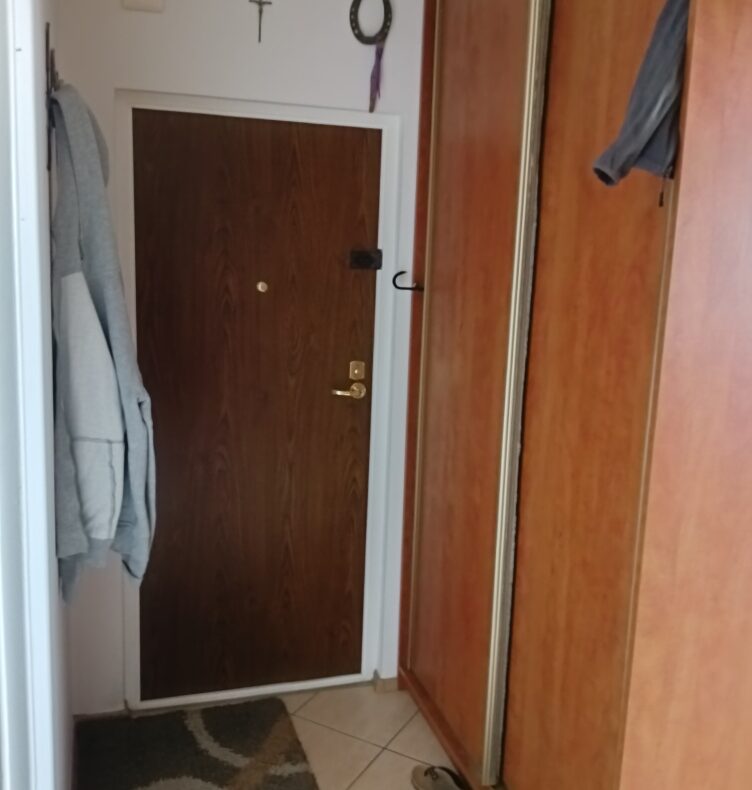 Przedpokój zabudowany szafami, solidne drzwi wejściowe.