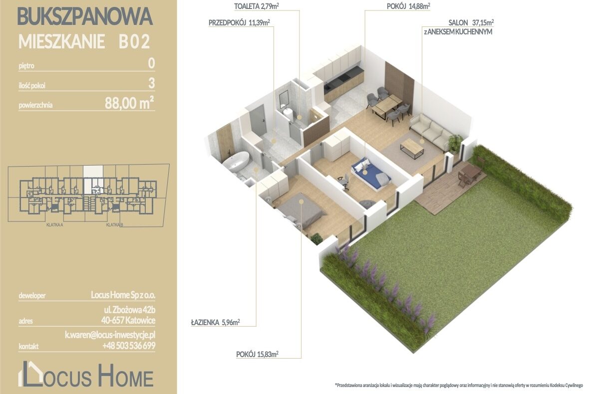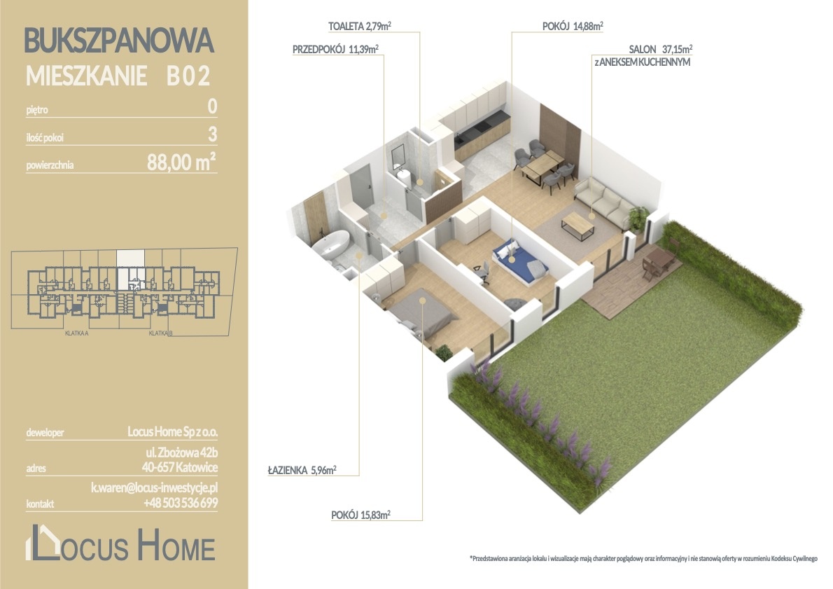 Spółka LOCUS HOME to DEWELOPER który realizuje inwestycje mieszkaniowe na terenie Katowic od wielu lat. NOWA inwestycja na ulicy BUKSZPANOWEJ (obok nr 19) w Piotrowicach to nowoczesny apartamentowiec w doskonałej lokalizacji Katowic.