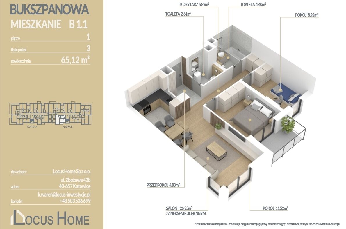 Przedstawiamy ofertę mieszkania 3 – pokojowego Z OGRZEWANIEM PODŁOGOWYM o powierzchni 65,12 m² z balkonem, zlokalizowanego na pierwszym piętrze budynku, oznaczonego nr B 1.1