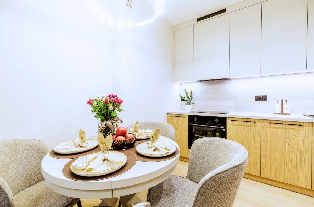 W pełni wyposażona kuchnia to raj dla miłośników gotowania, stworzysz tam ulubione posiłki. AGD nowe z gwarancja : płyta indukcyjna, piekarnik, okap, – wszystko czeka na Ciebie.