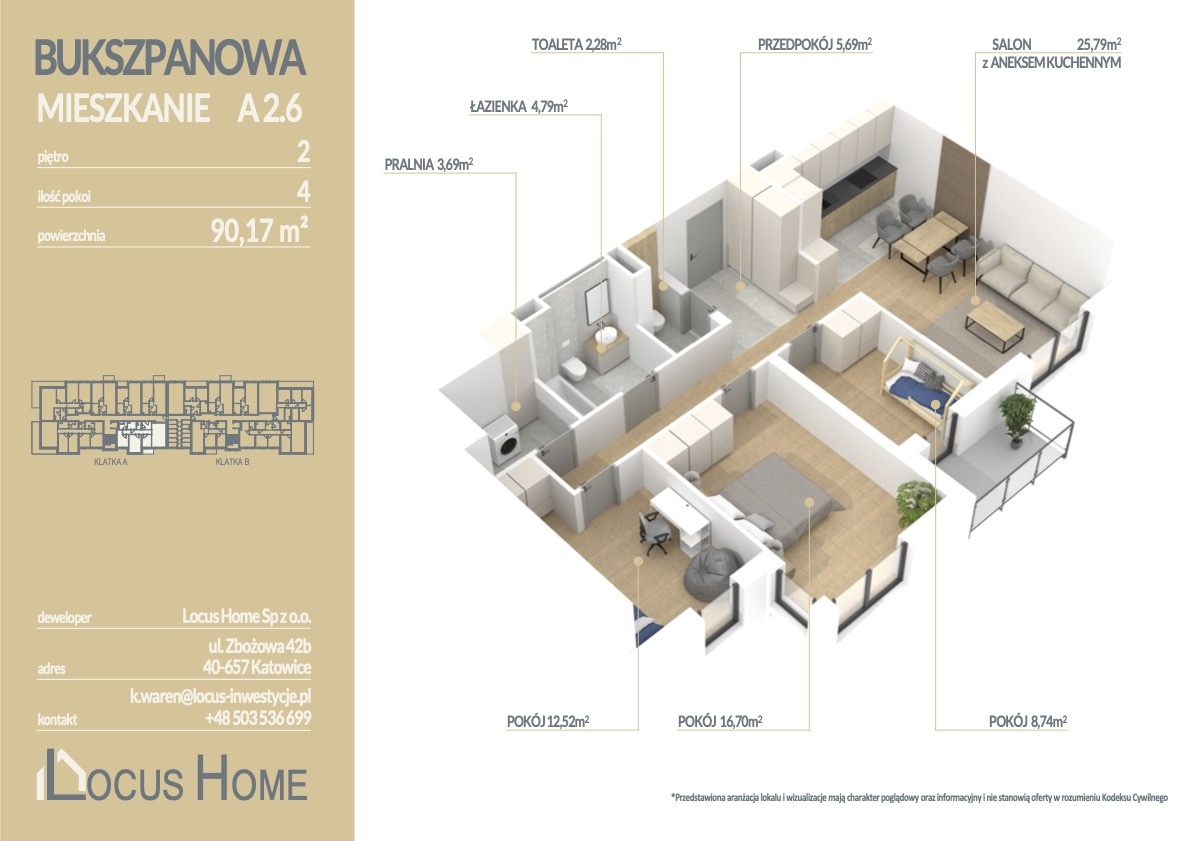 Przedstawiamy ofertę mieszkania 4 – pokojowego o powierzchni 90,17 m² z balkonem, zlokalizowanego na drugim piętrze budynku, oznaczonego nr A 2.6