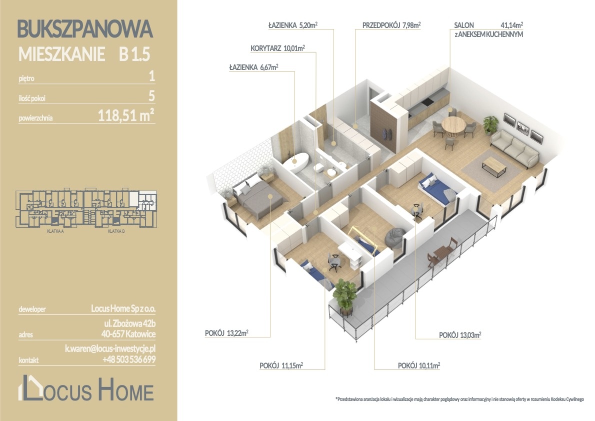 Przedstawiamy ofertę mieszkania 5 – pokojowego Z OGRZEWANIEM PODŁOGOWYM o powierzchni 118,51 m² z balkonem, zlokalizowanego na pierwszym piętrze budynku, oznaczonego nr B 1.5