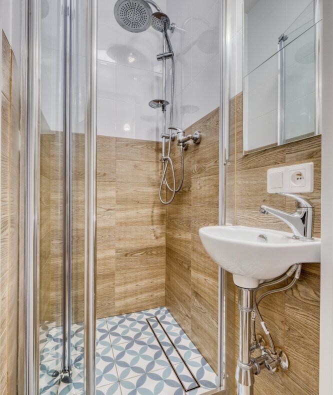 – – – – – pełna łazienka, a w niej: prysznic, WC, umywalka, pralka
