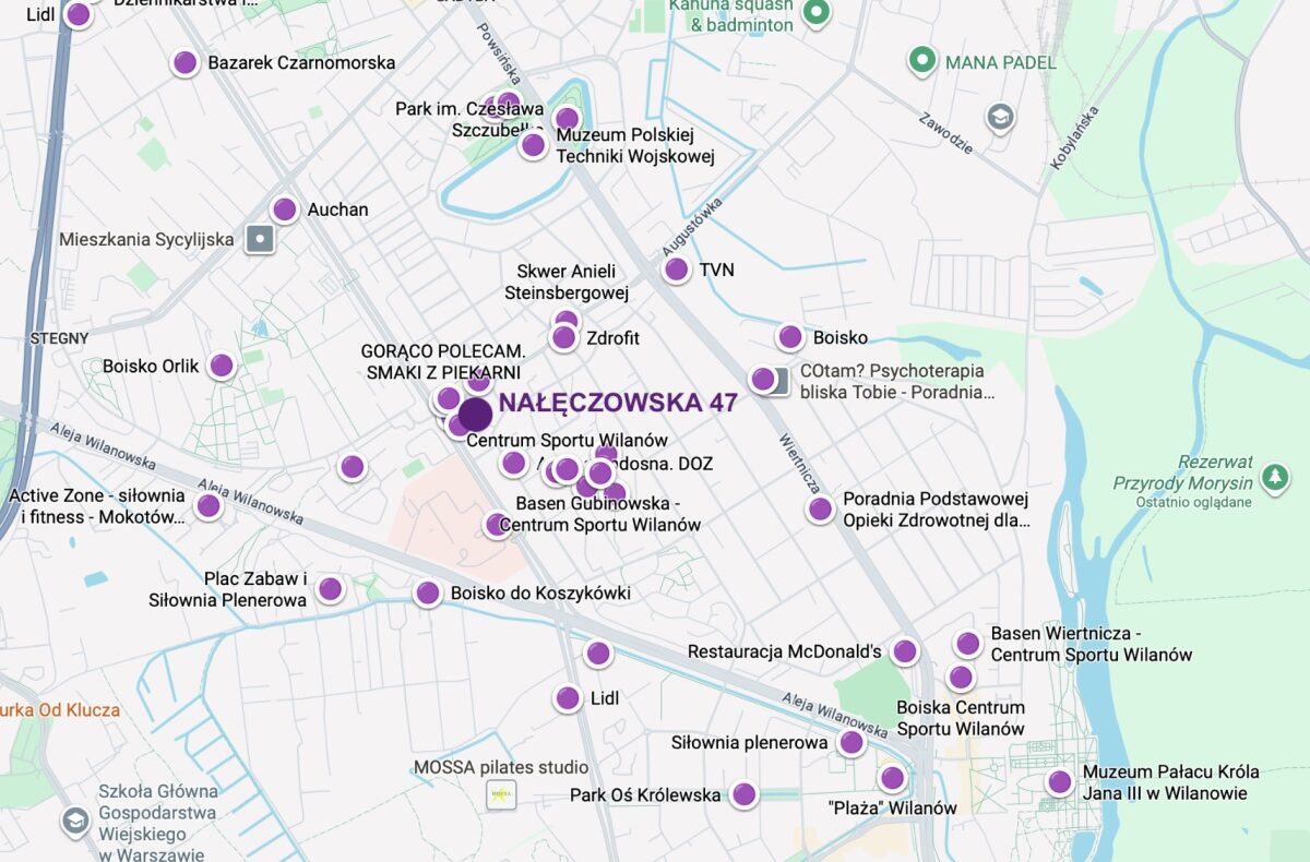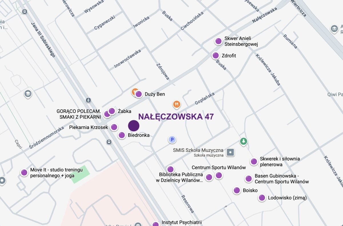 Mieszkanie znajduje się przy skrzyżowaniu ulic Sobieskiego i Nałęczowskiej na granicy Dzielnic: Mokotów i Wilanów.