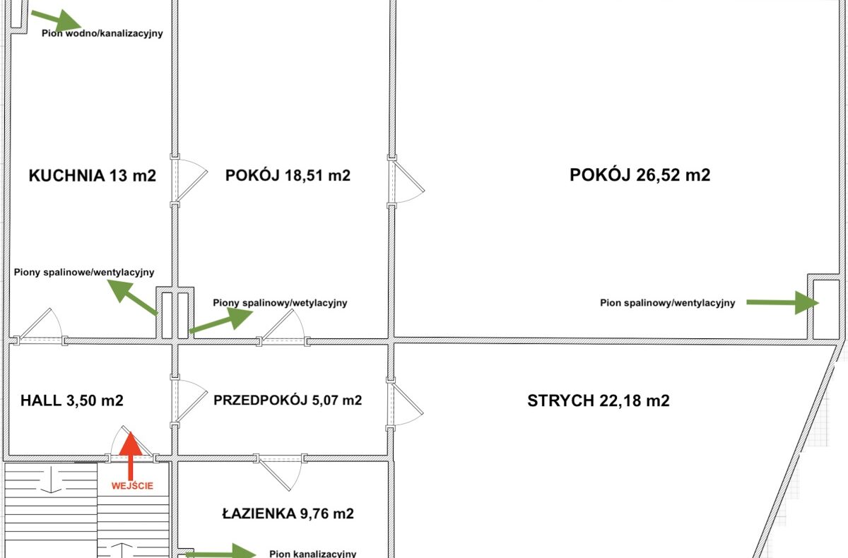 Ogrzewanie: obecne piece kaflowe, możliwość zrobienia ogrzewania elektrycznego lub piec na Pelet z rozprowadzeniem centralnym.
