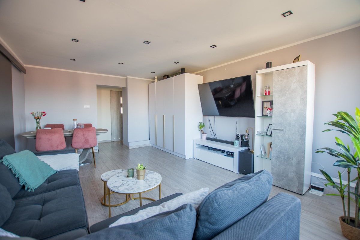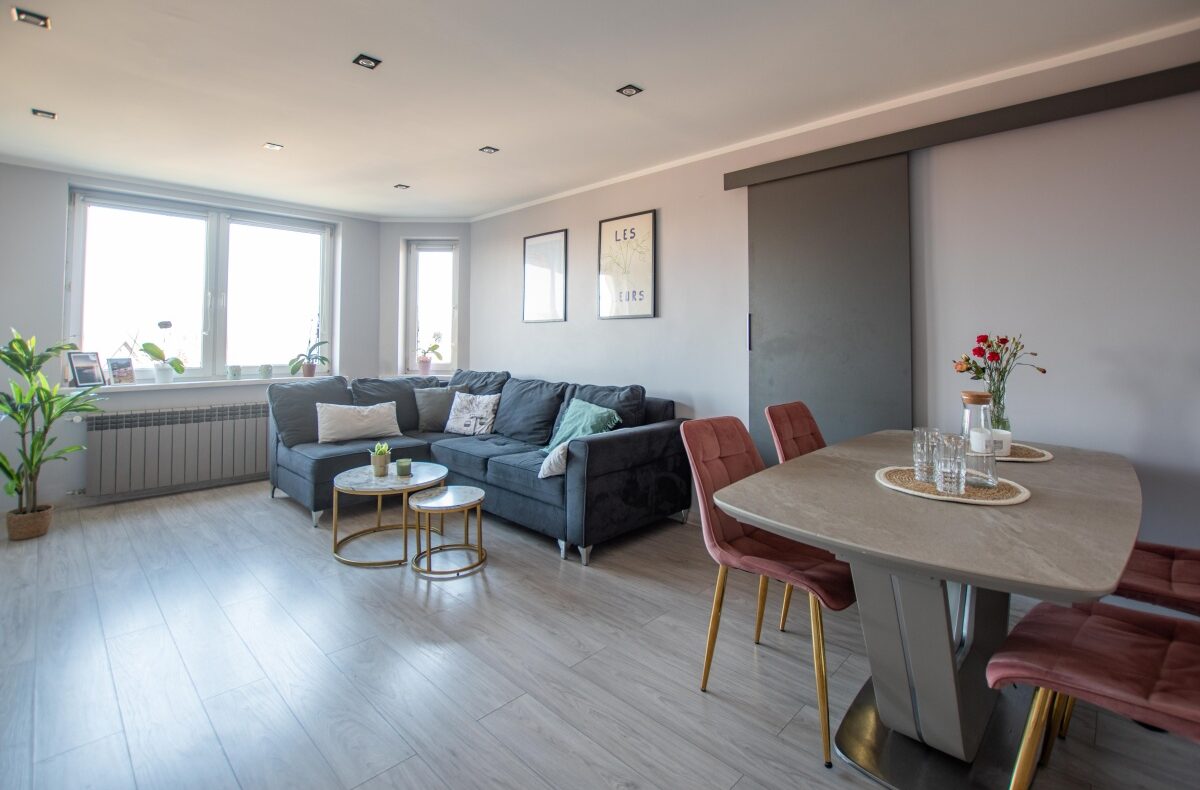– Salon z garderobą – jasny i ustawny, z dużą ilością naturalnego światła, idealny do codziennego wypoczynku i spotkań.