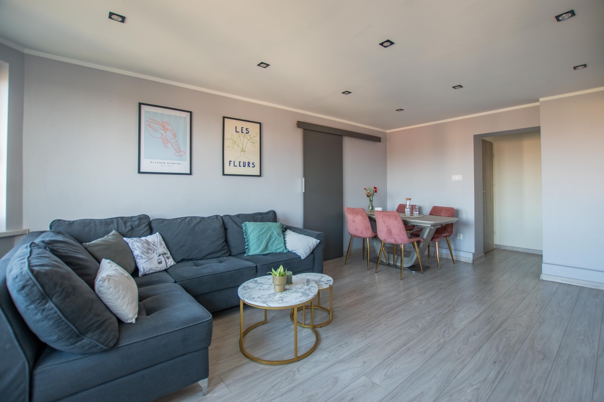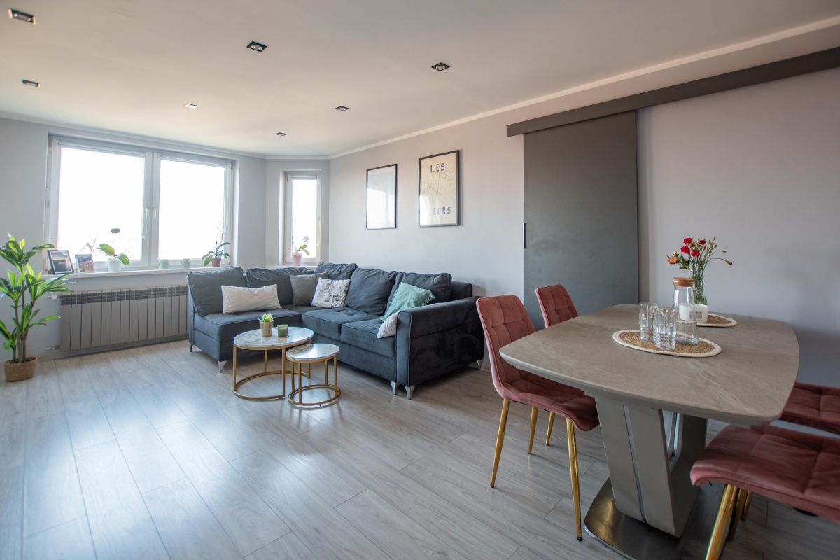 Mieszkanie o powierzchni 55 m² (powierzchnia użytkowa wpisana w księdze wieczystej). Ze względu na usytuowanie lokalu na poddaszu, powierzchnia po podłodze wynosi ok. 72 m². Skosy nadają wnętrzu wyjątkowego charakteru i tworzą przytulną, klimatyczną przestrzeń.