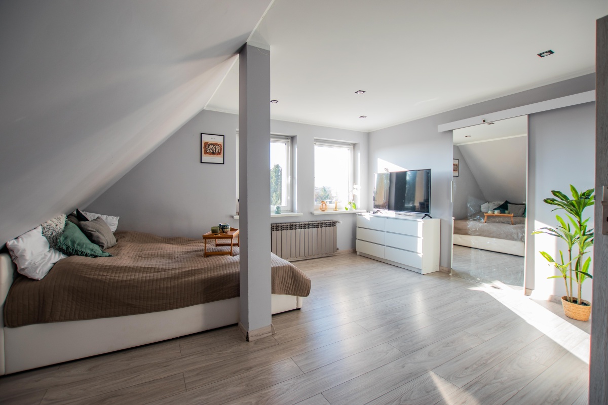 Oferujemy na sprzedaż przestronne mieszkanie na poddaszu o powierzchni 72 m² po podłodze (55 m² w księdze wieczystej), położone w Łęknicy, w województwie lubuskim, w bezpośrednim sąsiedztwie granicy polsko-niemieckiej.
