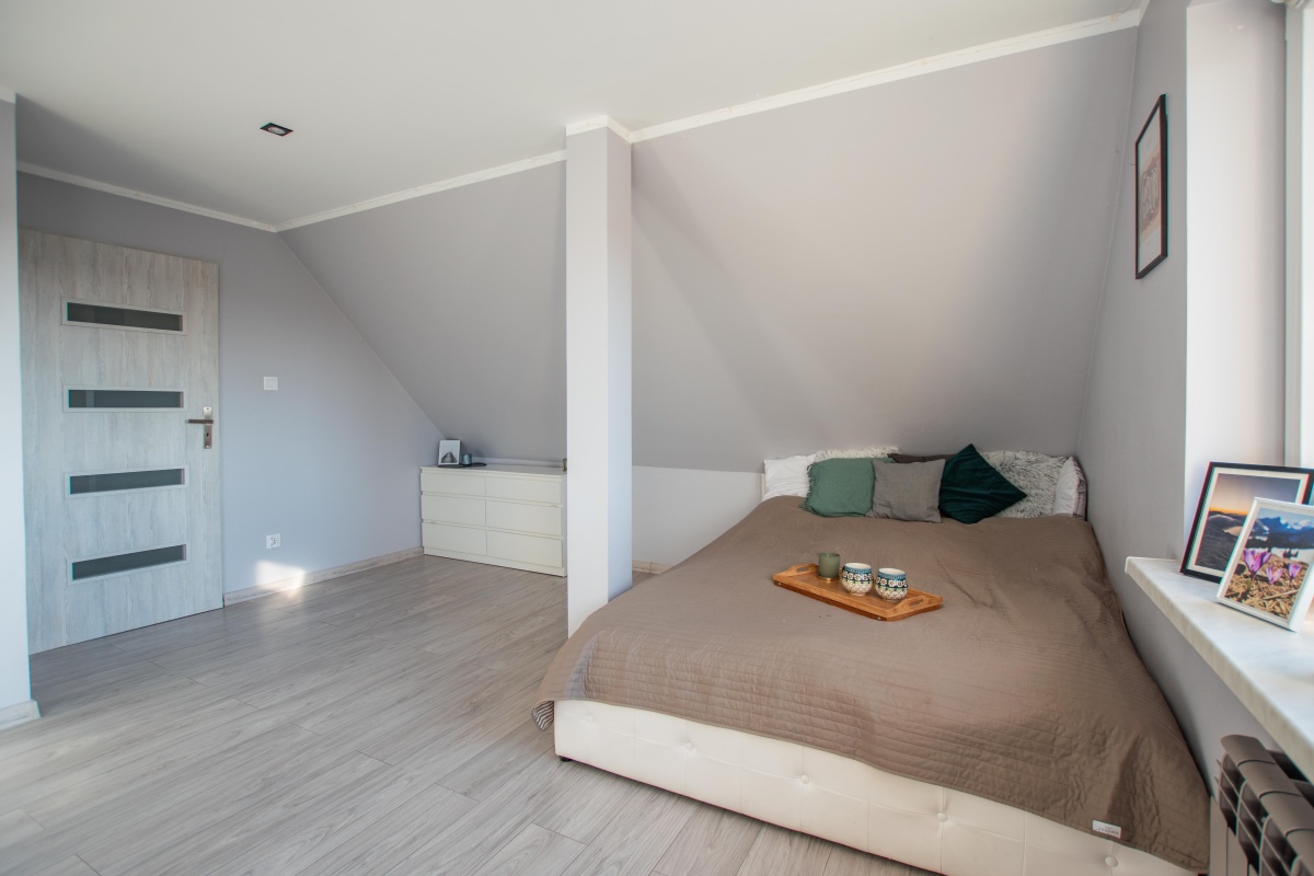 – Duża sypialnia – zapewniająca komfortową przestrzeń do odpoczynku.