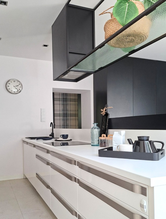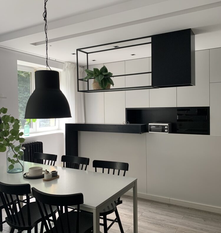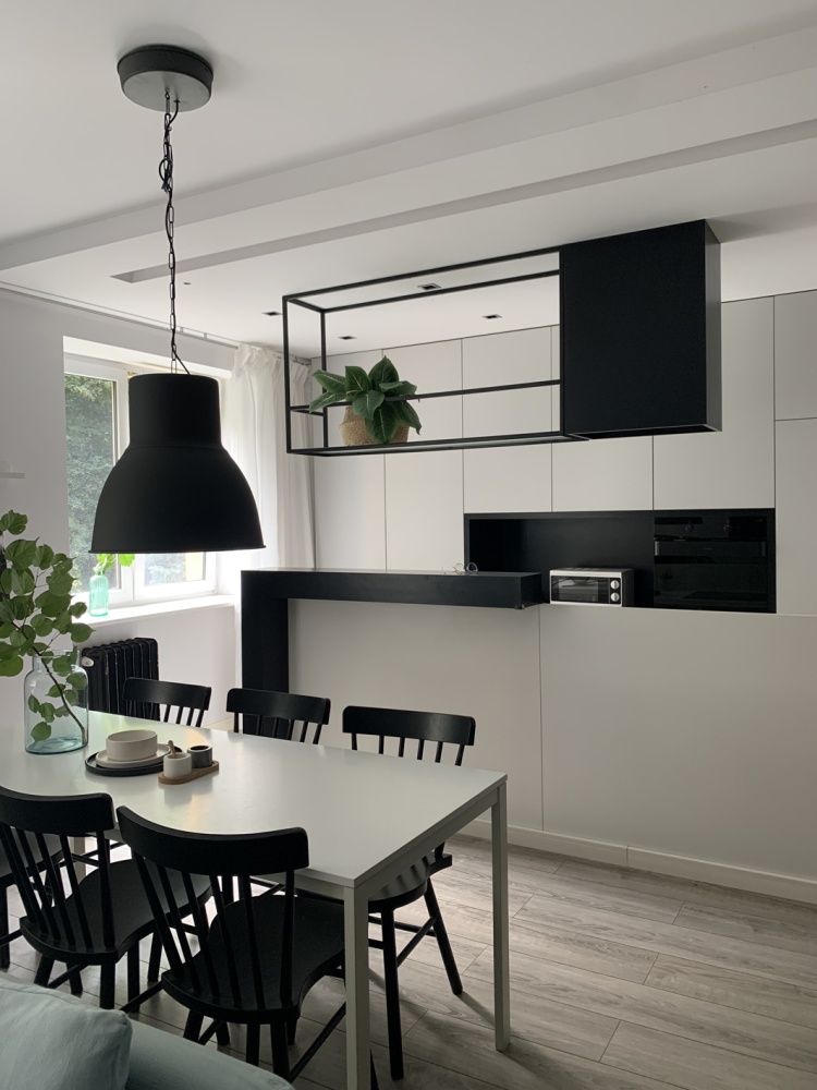 Kuchnia posiada sprzęty AGD w zabudowie (lodówka, piekarnik, zmywarka, pralka, płyta indukcyjna).