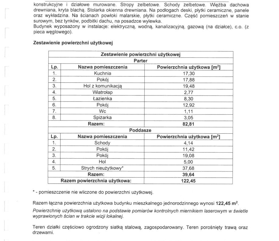 Działka zabudowana jest budynkiem mieszkalnym jednorodzinny, podpiwniczonym, parterowym z poddaszem użytkowym o powierzchni użytkowej 122,45 m2.